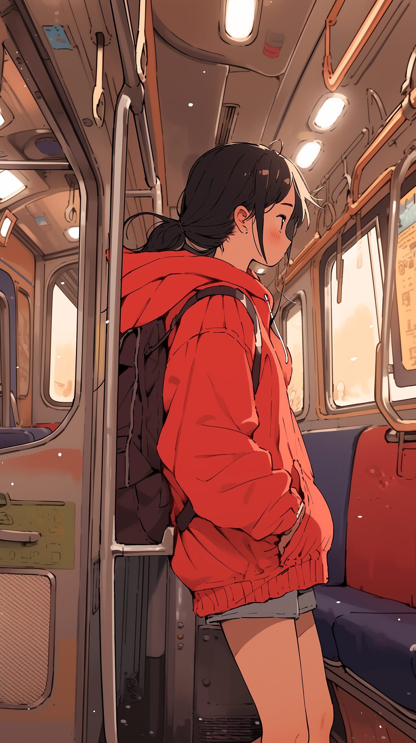 【壁紙】バスに乗って帰宅する赤パーカー女子のイラスト02