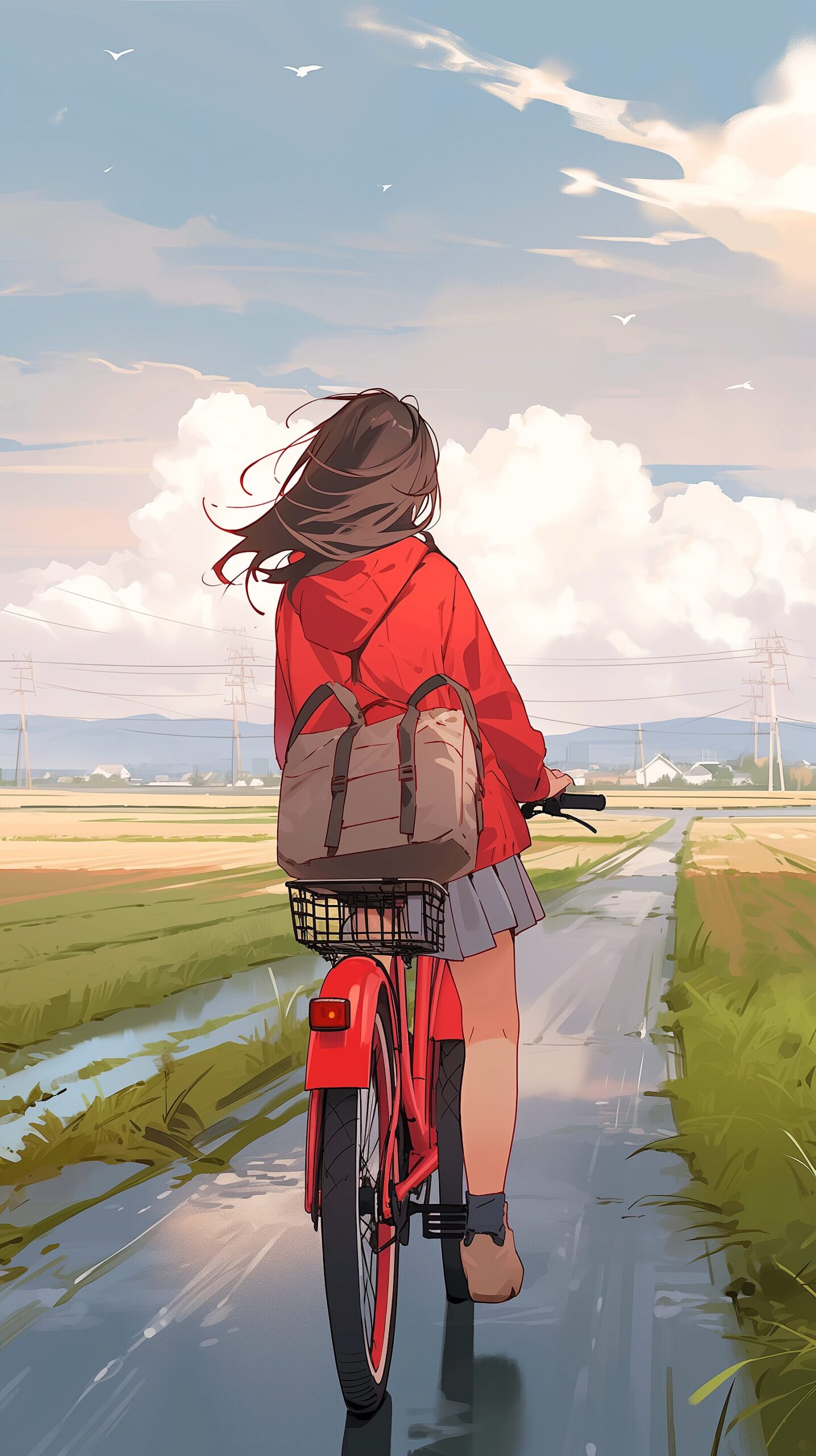 【壁紙】自転車を漕ぐ赤パーカーを着た女の子イラスト・後ろ姿07
