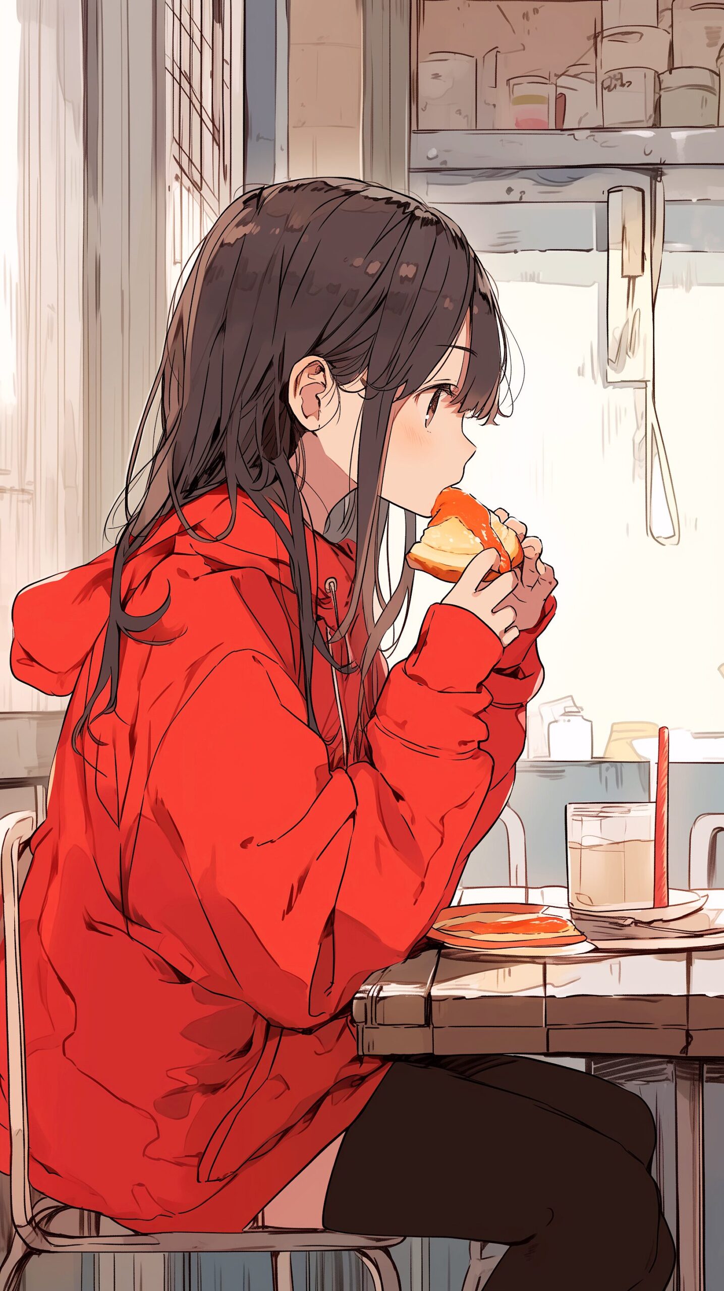 【壁紙】家で食パンを食べる赤パーカー女性イラスト10