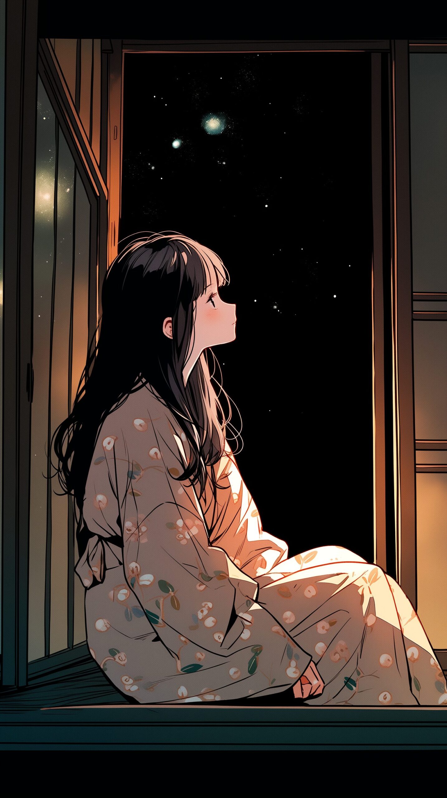 【壁紙】夜に部屋から星空を眺める女の子イラスト12