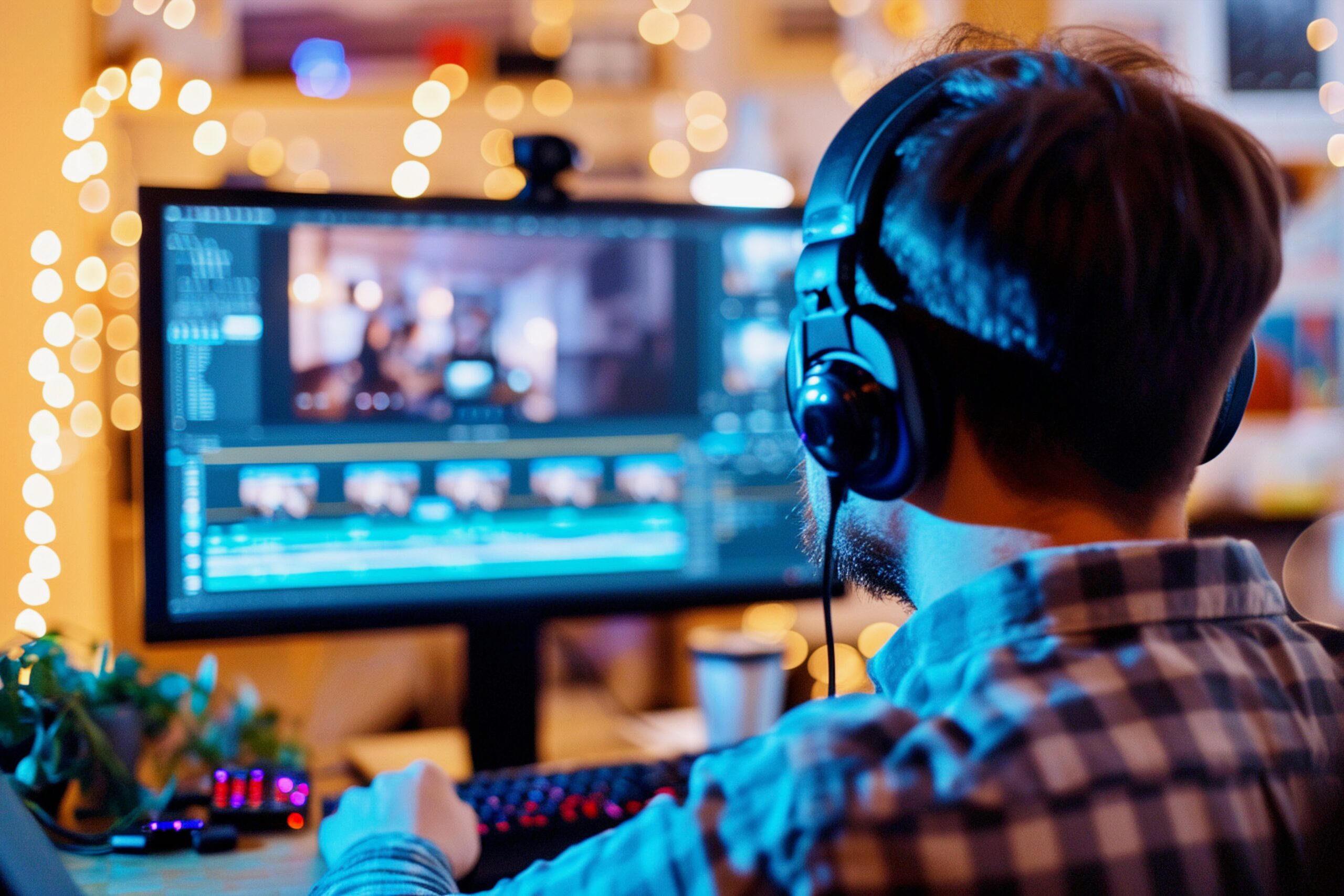 検索タグ:動画編集、動画編集マン、編集、男性、後ろ姿、パソコン、仕事、ビジネス、画像編集、副業、人物、編集シーン