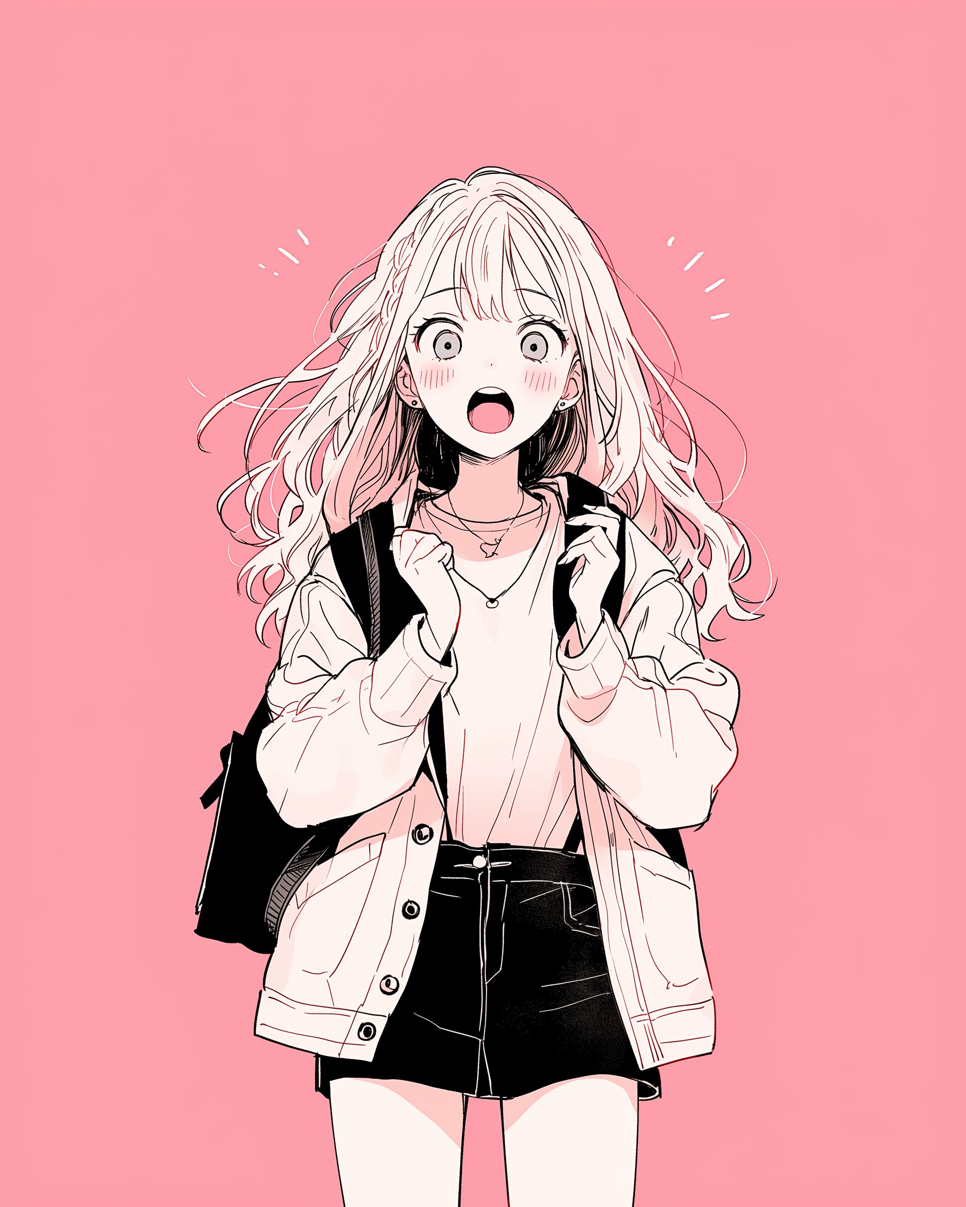 検索タグ:イラスト、ファッション、キャラクター、女性、女、女の子、女子、女の人、アニメ、漫画、マンガ、美人、美女、若い、かわいい、可愛い、カワイイ、人物、顔、美しい、綺麗、きれい、キレイ、アート、お洒落、女子高生、JK、挿絵、夏、春、パステルカラー、トップス、春服、インスタ、Instagram、ピンク、pink、驚き、驚く、驚愕、サプライズ、surprise