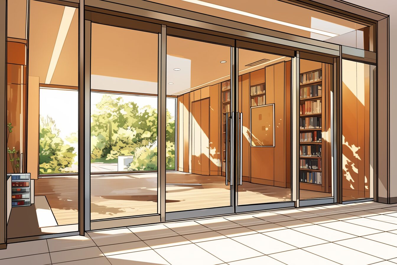 検索タグ:イラスト、AI生成画像、コピースペース、図書館、外観、入り口、出口、エントランス、建物、ガラス張り