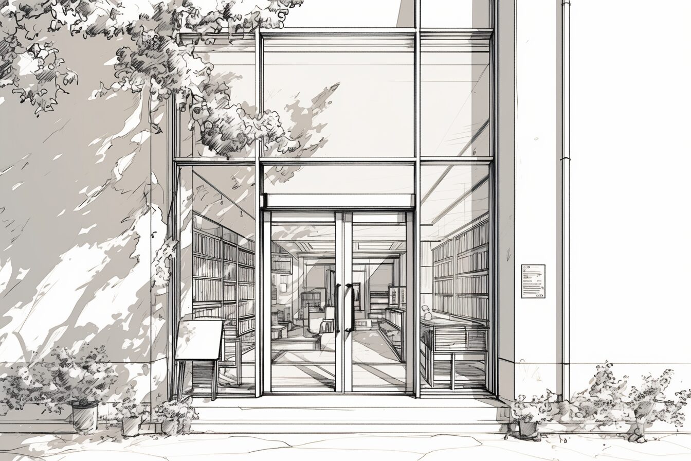検索タグ:イラスト、AI生成画像、コピースペース、図書館、外観、入り口、出口、エントランス、建物、ガラス張り