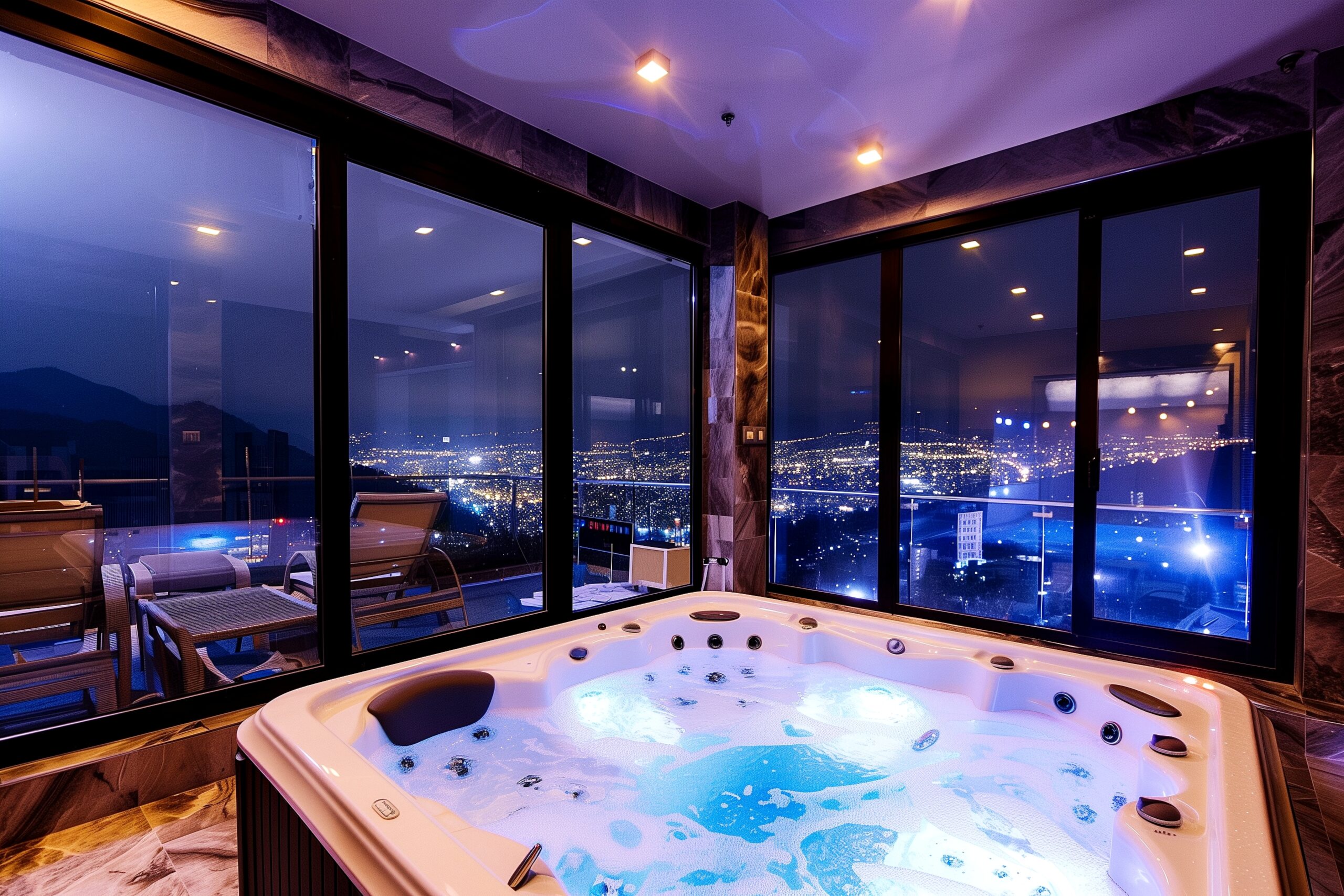 検索タグ:コピースペース・ポストカード、フリー素材・テキストスペース・ポスター・綺麗・美しい、リゾート、リゾート地、景色、風景、室内、ホテル、リゾートホテル、露天風呂、銭湯、風呂、ホテル、高級ホテル、ジャグジー、ジェットバス、お風呂、夜景、夜