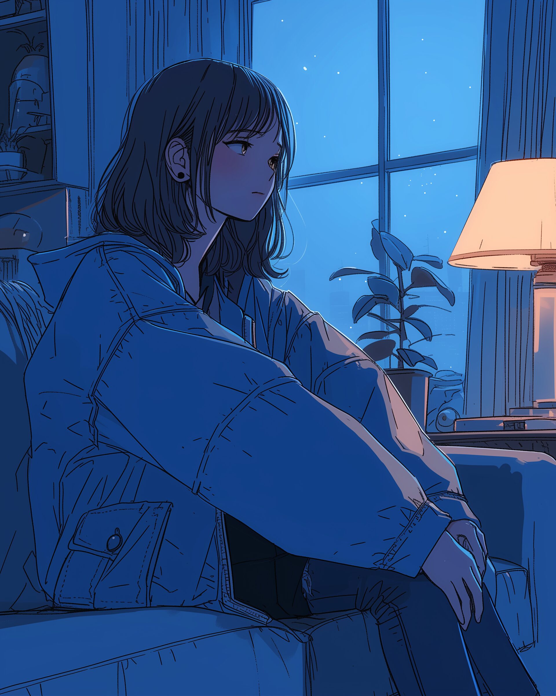 検索タグ:イラスト、ファッション、キャラクター、女性、女、女の子、女子、女の人、アニメ、漫画、マンガ、美人、美女、若い、かわいい、可愛い、カワイイ、人物、顔、美しい、綺麗、きれい、キレイ、アート、洋服、お洒落、女子高生、JK、横顔、切ない、挿絵、夜、青、ブルー、デニムジャケット