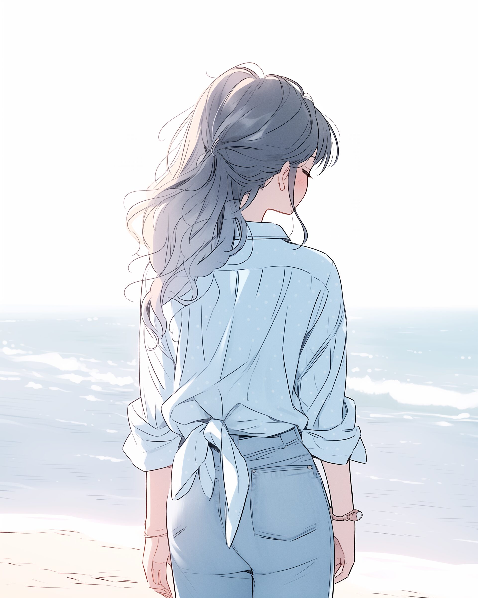検索タグ:イラスト、ファッション、キャラクター、女性、女、女の子、女子、女の人、アニメ、漫画、マンガ、美人、美女、若い、かわいい、可愛い、カワイイ、人物、顔、美しい、綺麗、きれい、キレイ、アート、お洒落、女子高生、JK、挿絵、夏、春、シャツ、トップス、春服、後ろ姿