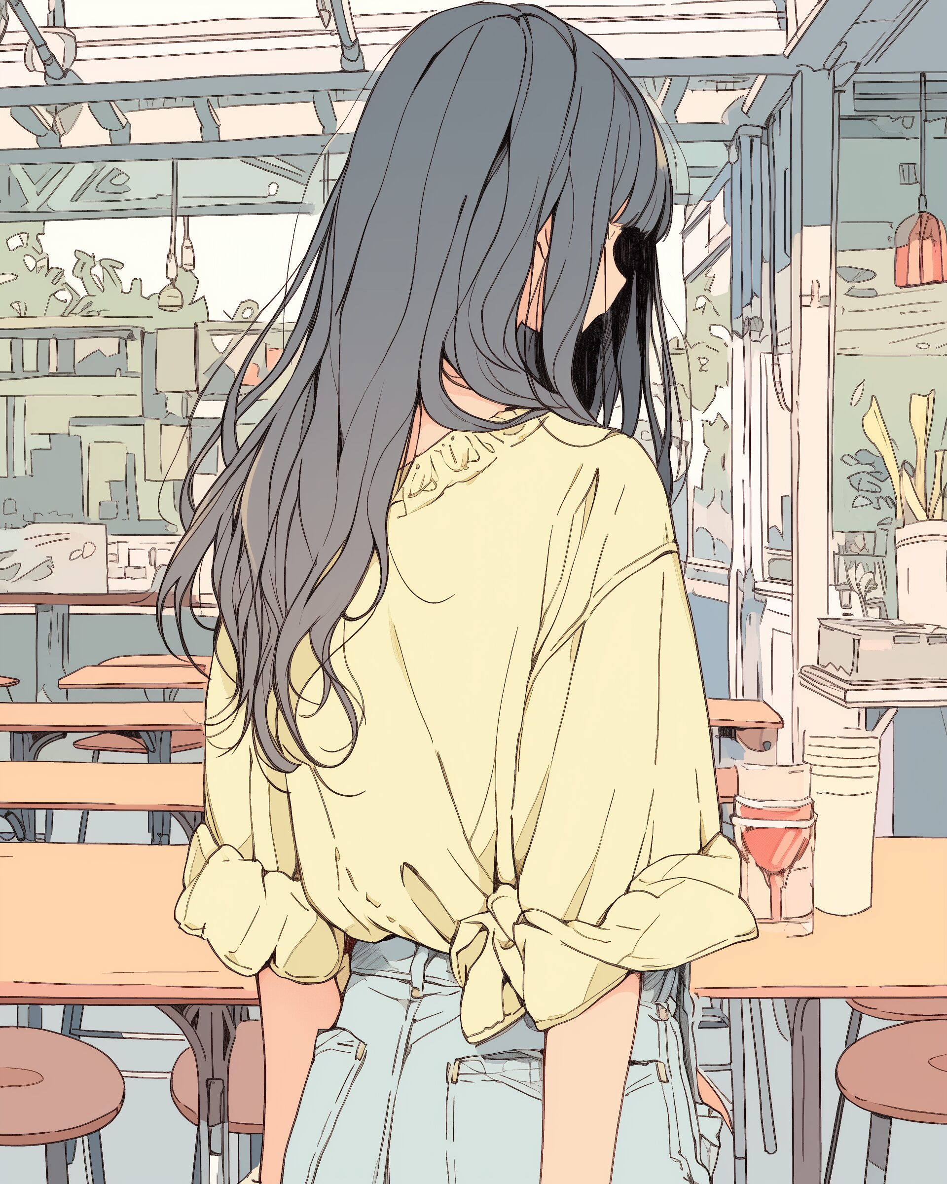検索タグ:イラスト、ファッション、キャラクター、女性、女、女の子、女子、女の人、アニメ、漫画、マンガ、美人、美女、若い、かわいい、可愛い、カワイイ、人物、顔、美しい、綺麗、きれい、キレイ、アート、お洒落、女子高生、JK、挿絵、夏、春、シャツ、トップス、春服、後ろ姿