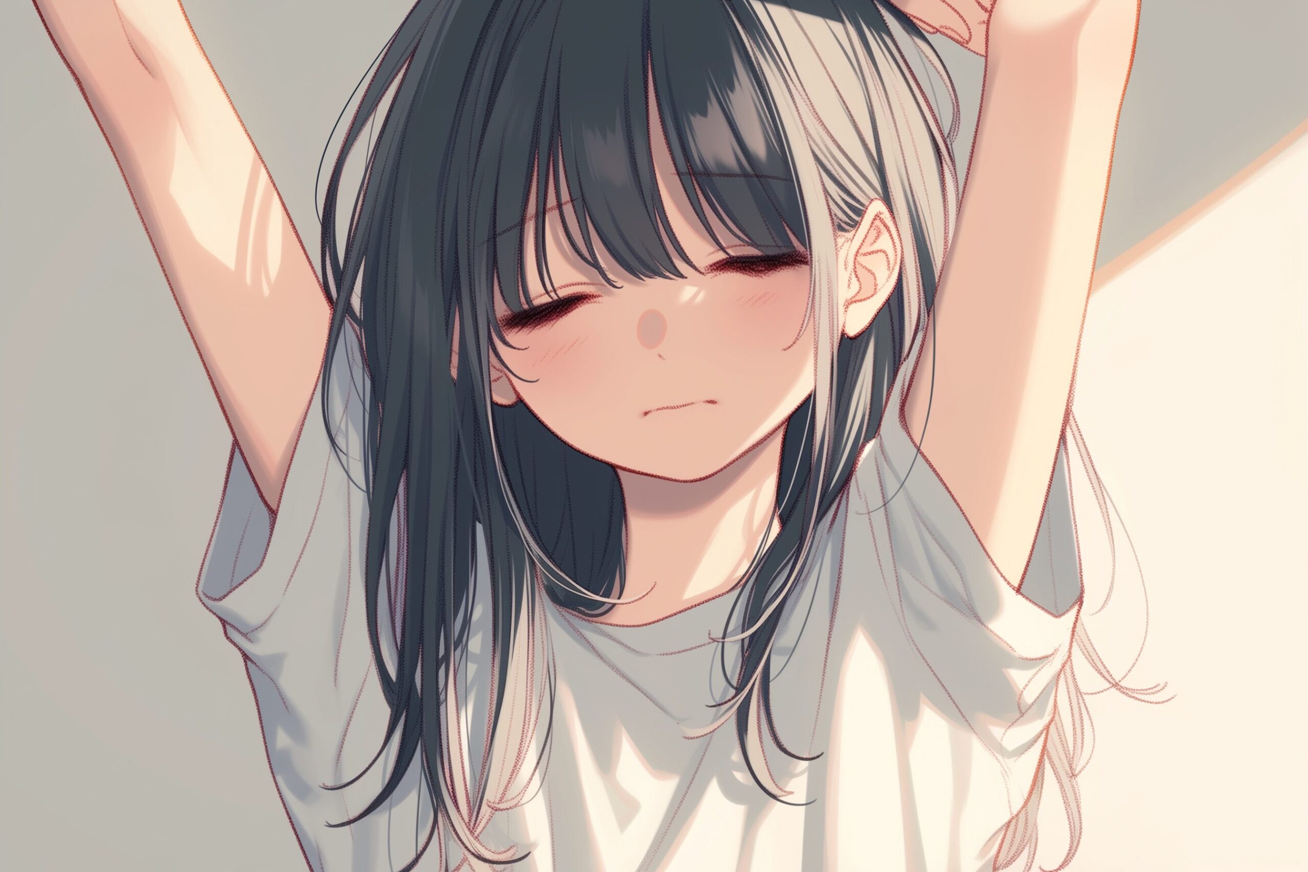 検索タグ:イラスト、ファッション、キャラクター、女性、女、女の子、女子、女の人、アニメ、漫画、マンガ、美人、美女、若い、かわいい、可愛い、カワイイ、人物、顔、美しい、綺麗、きれい、キレイ、アート、お洒落、挿絵、インスタ、Instagram、AI生成画像、fashion、コピースペース、寝起き、黒髪、ロングヘア、伸び、ストレッチ