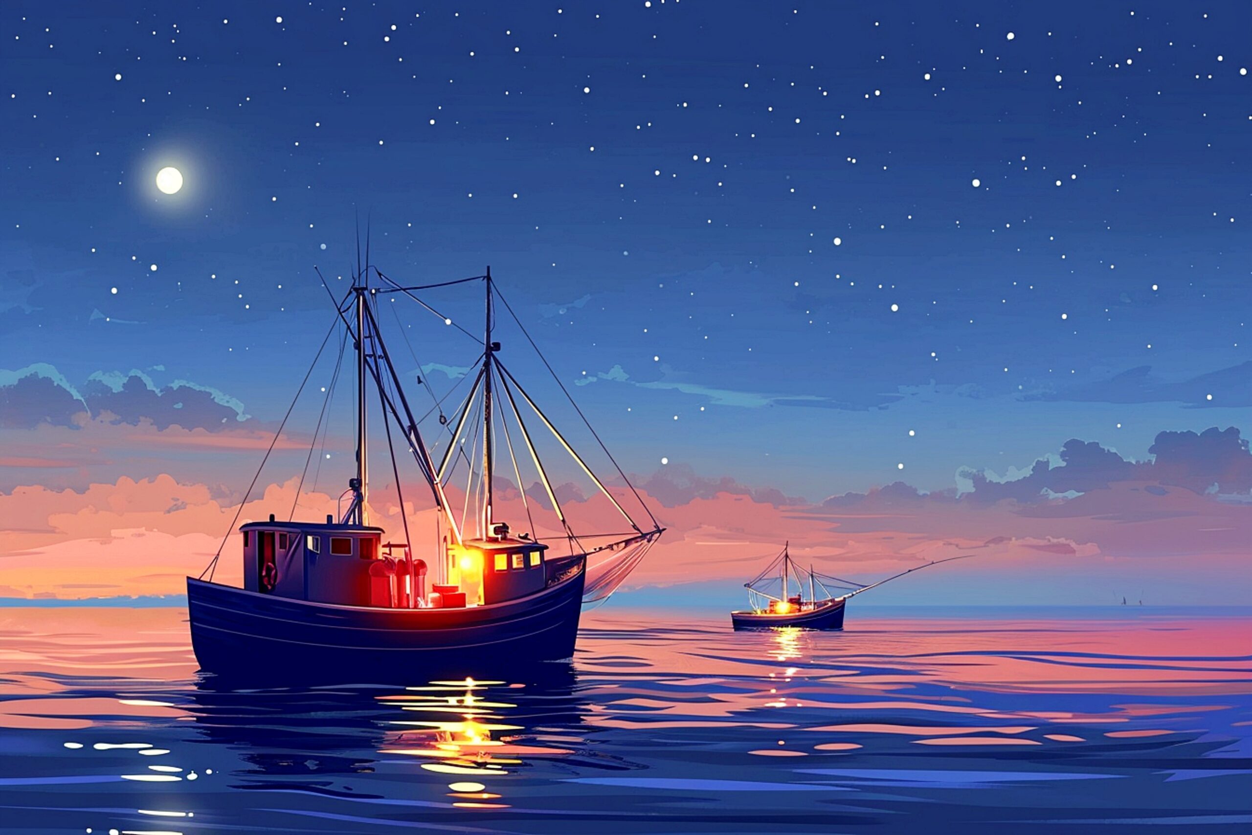 検索タグ:イラスト、小船、船、夜釣り、夜、月、漁師、漁、絵画、釣り、船出、星空、乗り物