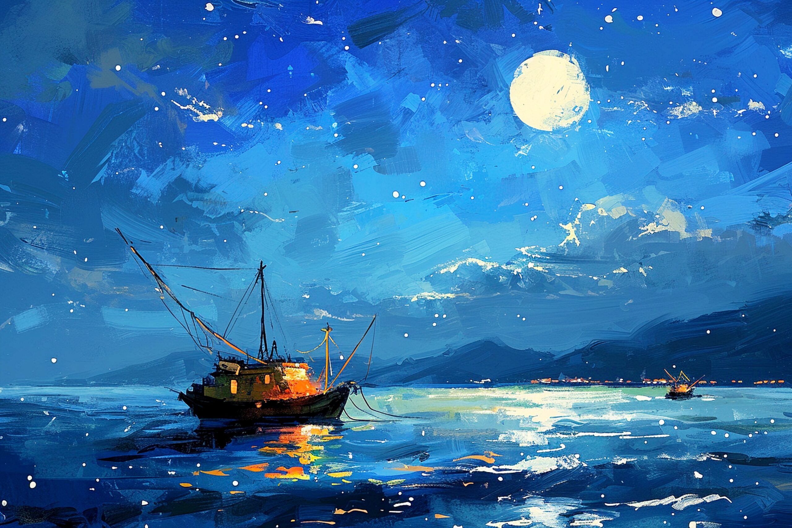 検索タグ:イラスト、小船、船、夜釣り、夜、月、漁師、漁、絵画、釣り、船出、星空、乗り物