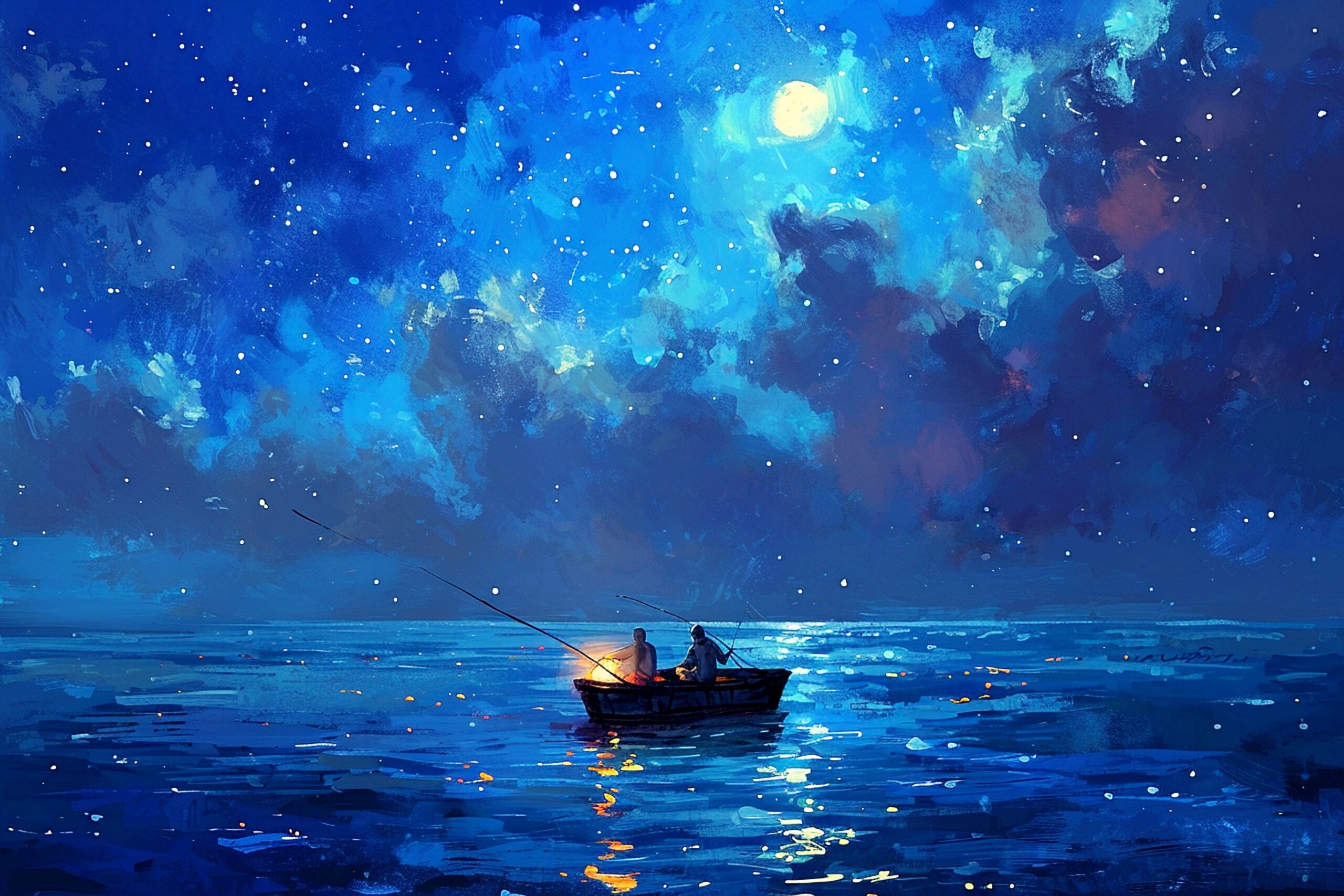 検索タグ:イラスト、小船、船、夜釣り、夜、月、漁師、漁、絵画、釣り、船出、星空、乗り物