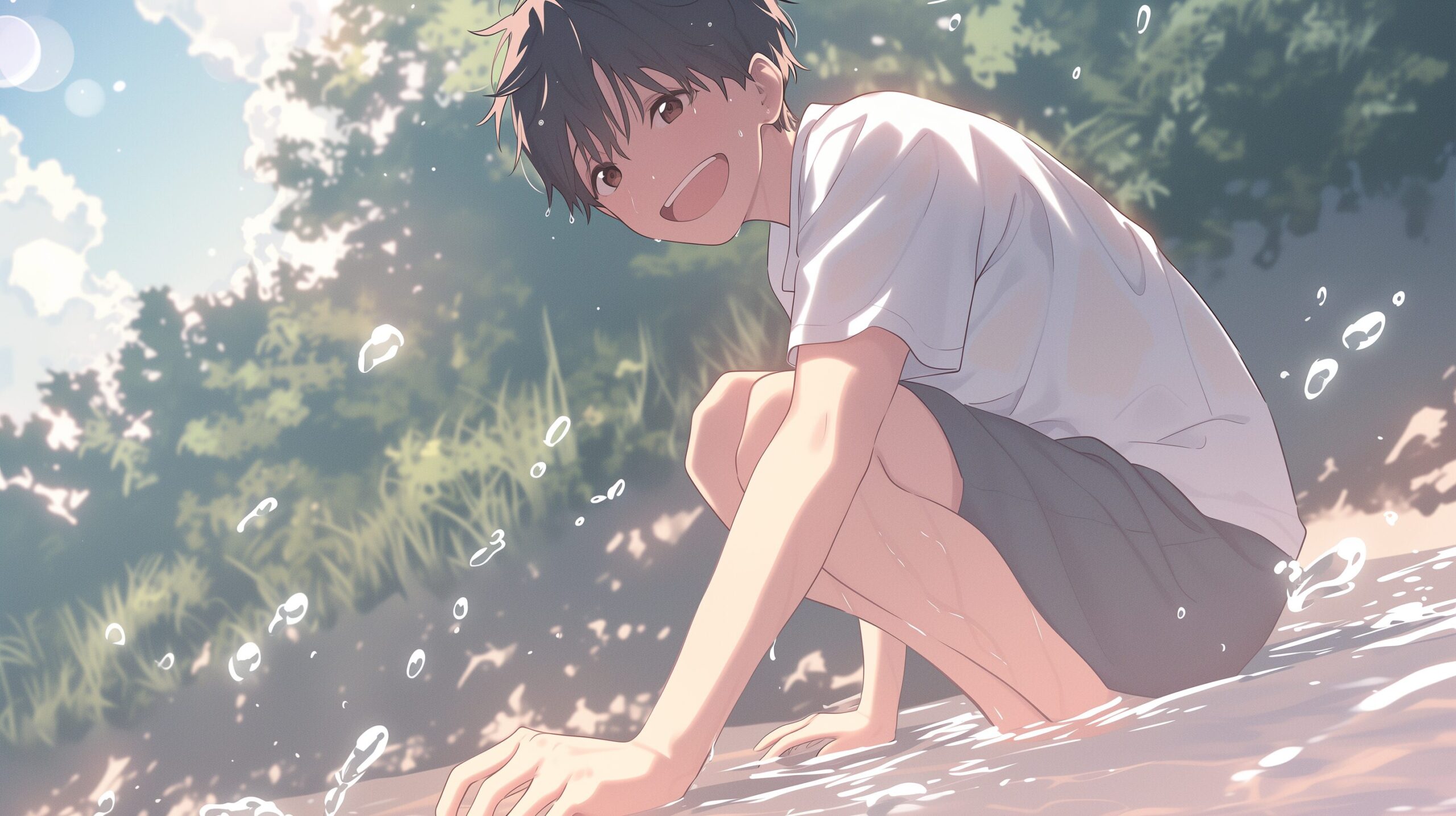 検索タグ:イラスト、ファッション、キャラクター、男性、男、男子、男の子、男の人、アニメ、漫画、マンガ、若い、人物、顔、アート、挿絵、インスタ、Instagram、AI生成画像、fashion、コピースペース、学生、高校生、大学生、照れる、恥ずかしい、もどかしい、夏服、制服、白シャツ、青空、晴れ、夏、青春、笑顔、中学生、田舎、川辺、川