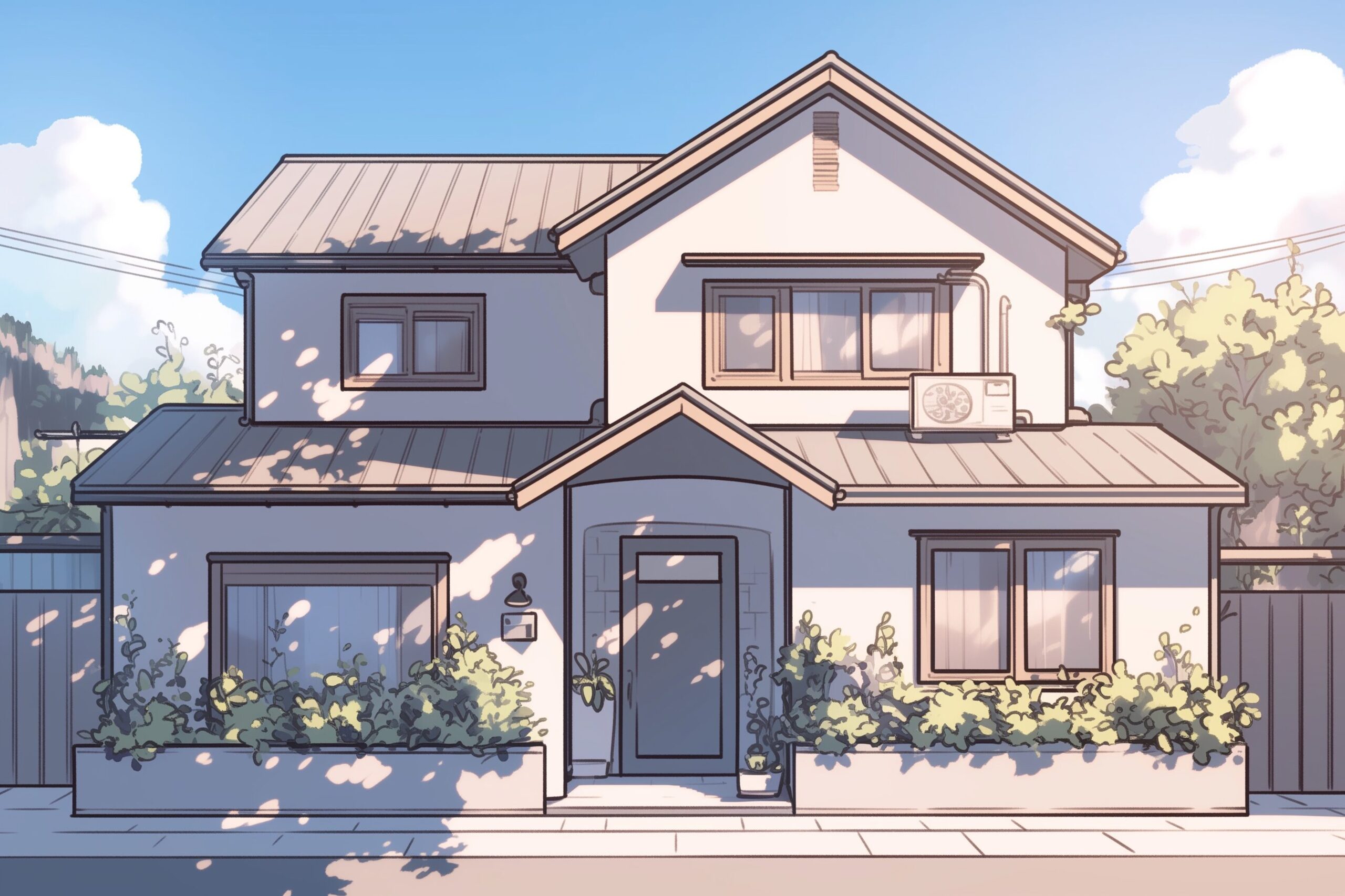 検索タグ:イラスト、AI生成画像、コピースペース、外観、建物、家、戸建て、一軒家、自宅