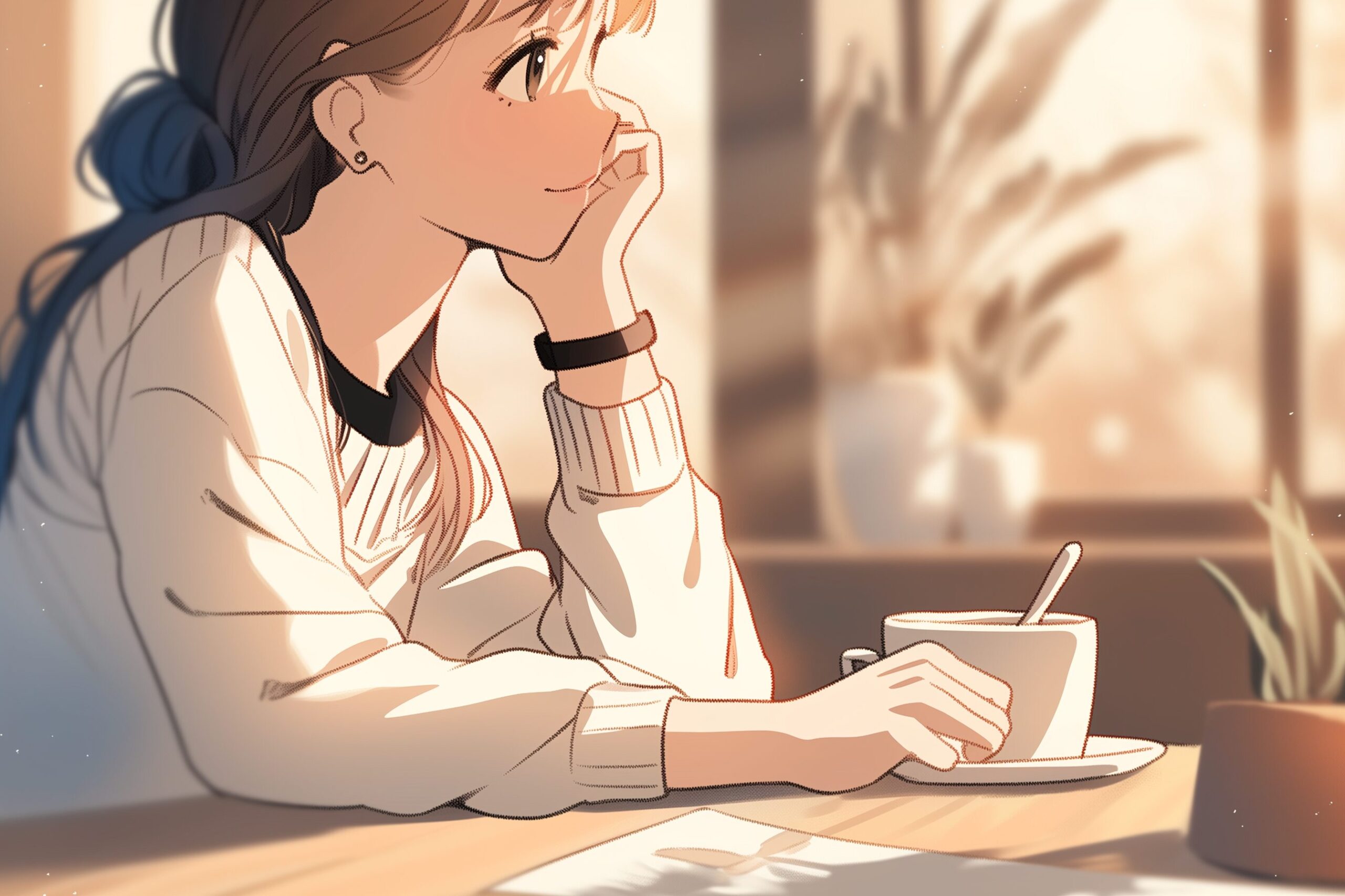 検索タグ:イラスト、キャラクター、女性、女、女の子、女子、女の人、アニメ、漫画、マンガ、美人、美女、若い、かわいい、可愛い、カワイイ、人物、顔、美しい、綺麗、きれい、キレイ、アート、お洒落、挿絵、インスタ、Instagram、AI生成画像、コピースペース、黒髪、カフェ、待ち合わせ