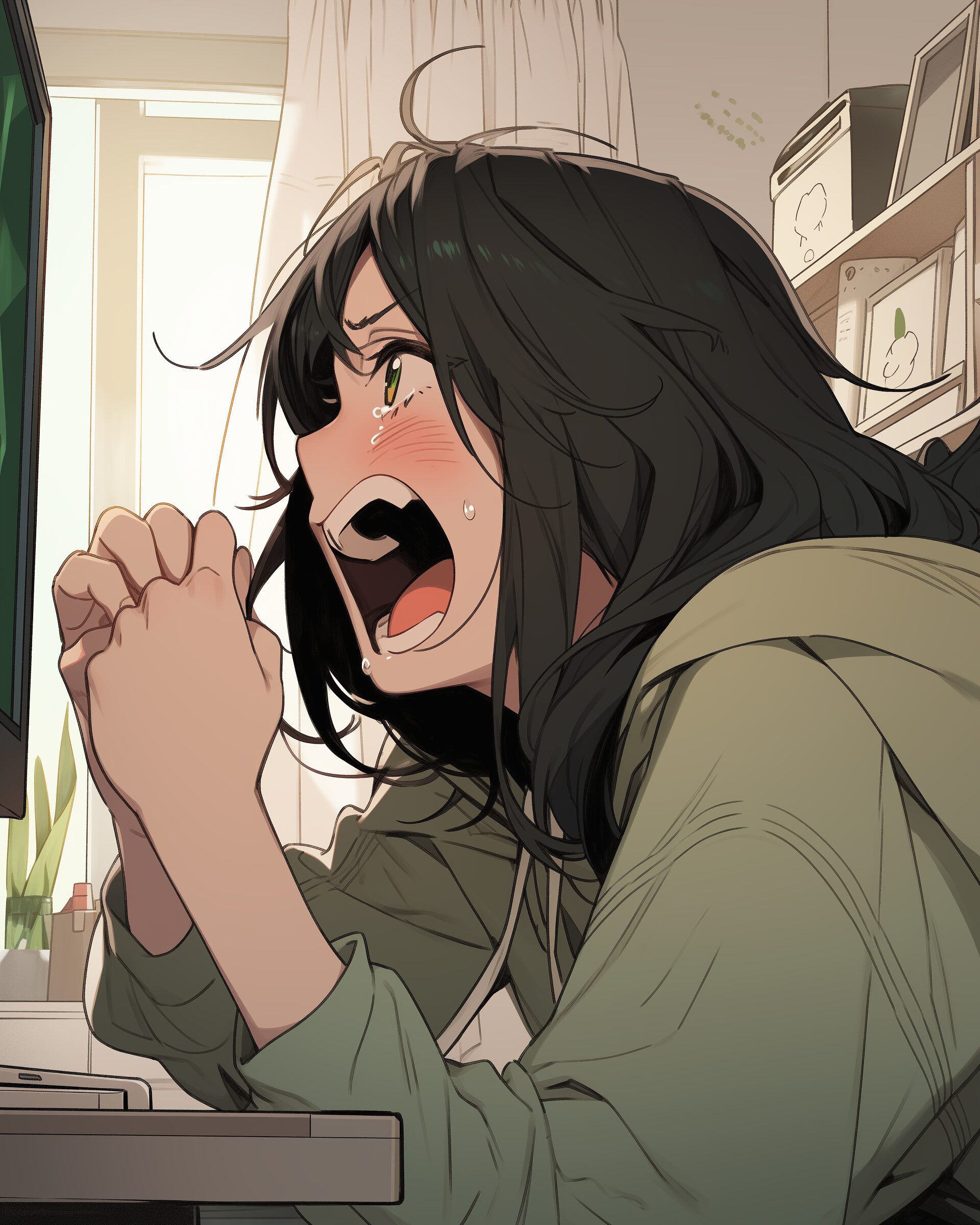 検索タグ:イラスト、ファッション、キャラクター、女性、女、女の子、女子、女の人、アニメ、漫画、マンガ、美人、美女、若い、かわいい、可愛い、カワイイ、人物、顔、美しい、綺麗、きれい、キレイ、アート、お洒落、女子高生、JK、挿絵、夏、春、パステルカラー、パーカー、パーカー女子、hoodie、グリーン、Green、緑、感情、叫ぶ、泣く、cry、emotion