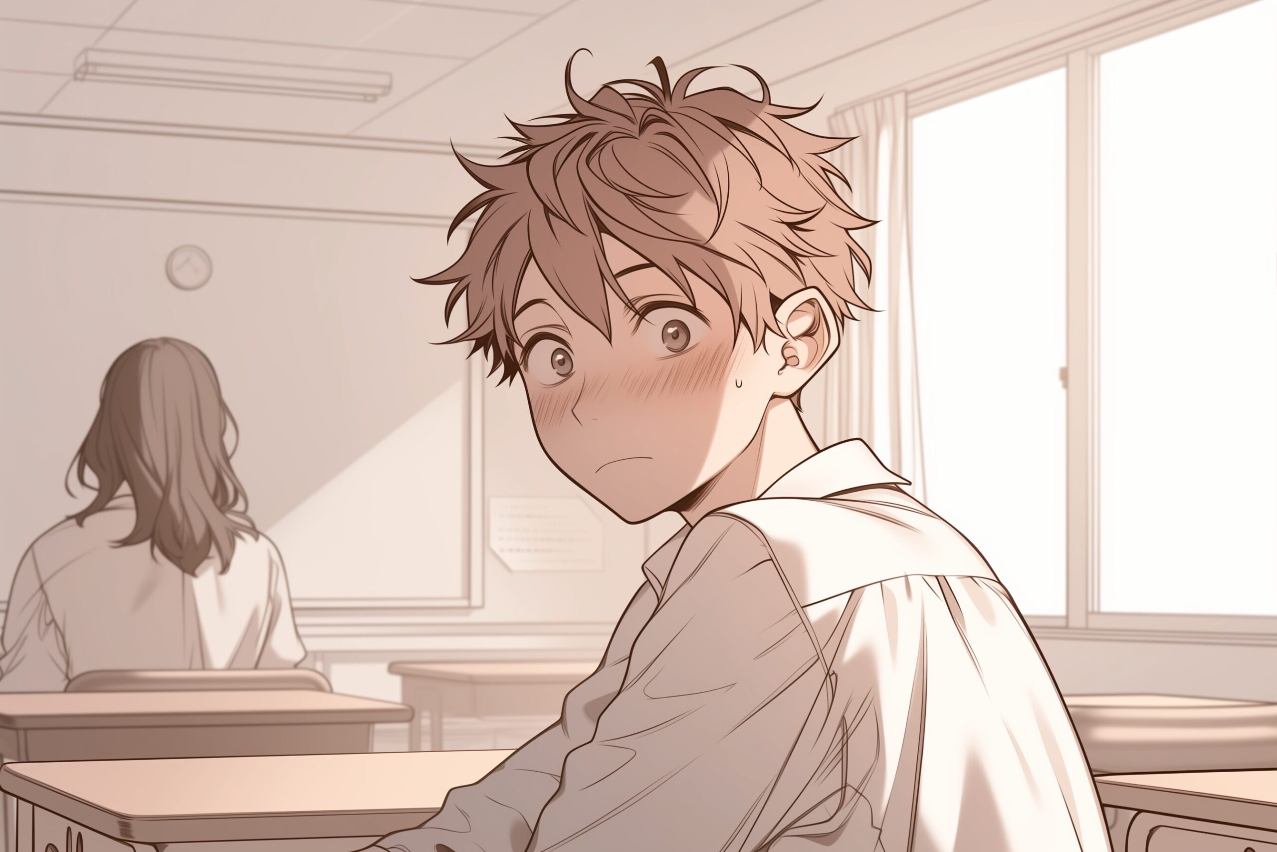 検索タグ:イラスト、ファッション、キャラクター、男性、男、男子、男の子、男の人、アニメ、漫画、マンガ、若い、人物、顔、アート、挿絵、インスタ、Instagram、AI生成画像、fashion、コピースペース、授業中、学校、教室、振り向く、振り返る、後ろ姿、後を見る