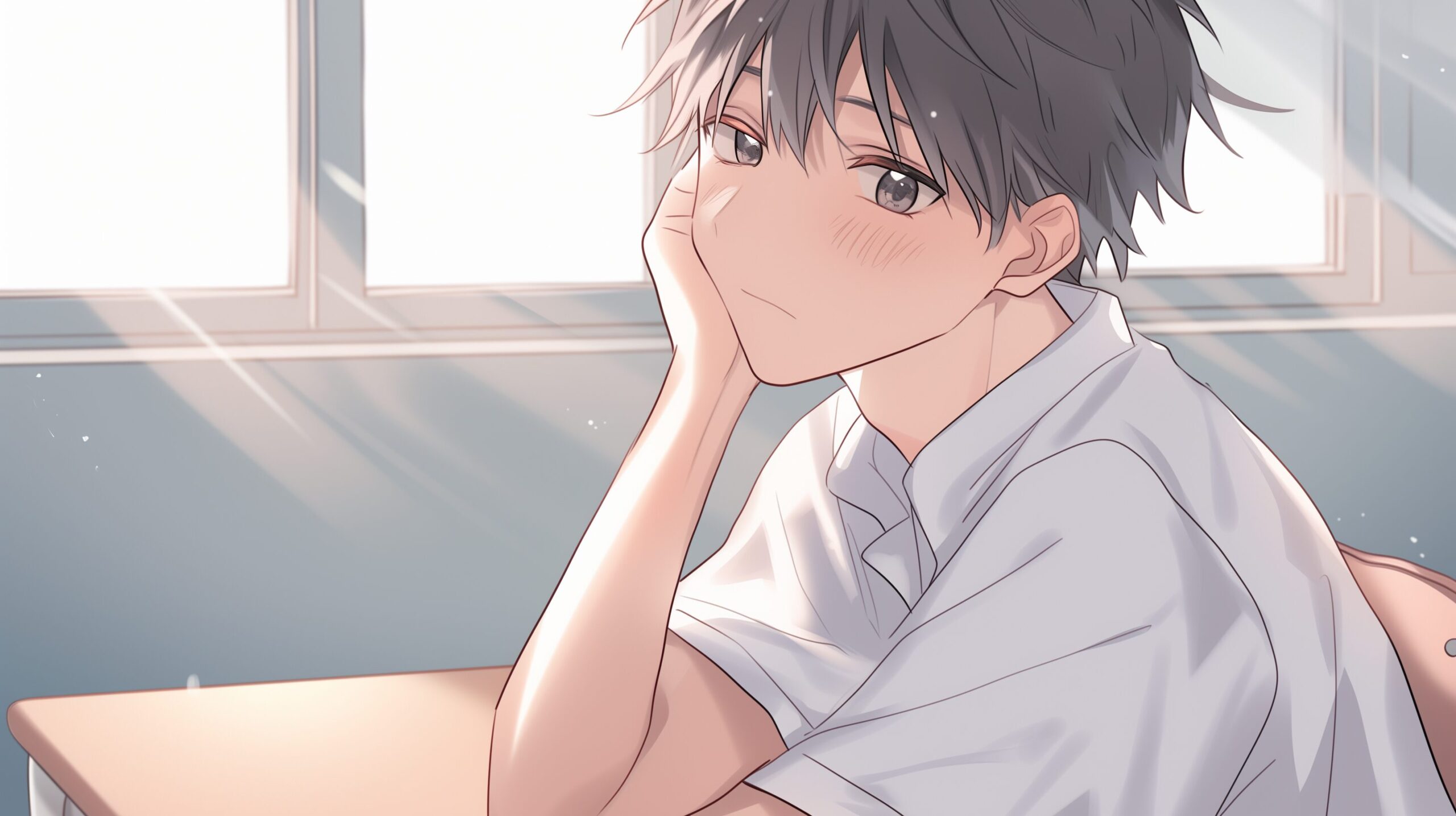 検索タグ:イラスト、ファッション、キャラクター、男性、男、男子、男の子、男の人、アニメ、漫画、マンガ、若い、人物、顔、アート、挿絵、インスタ、Instagram、AI生成画像、fashion、コピースペース、学生、高校生、大学生、夏服、制服、白シャツ、夏、青春、中学生、教室、学校、考える、悩む、悩み、恋愛、上の空、夏恋、natsukoi