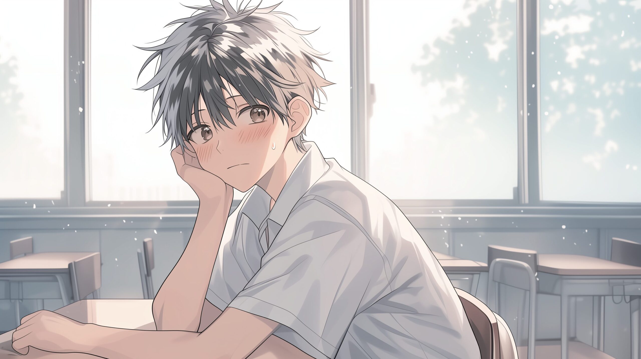 検索タグ:イラスト、ファッション、キャラクター、男性、男、男子、男の子、男の人、アニメ、漫画、マンガ、若い、人物、顔、アート、挿絵、インスタ、Instagram、AI生成画像、fashion、コピースペース、学生、高校生、大学生、夏服、制服、白シャツ、夏、青春、中学生、教室、学校、考える、悩む、悩み、恋愛、上の空、夏恋、natsukoi