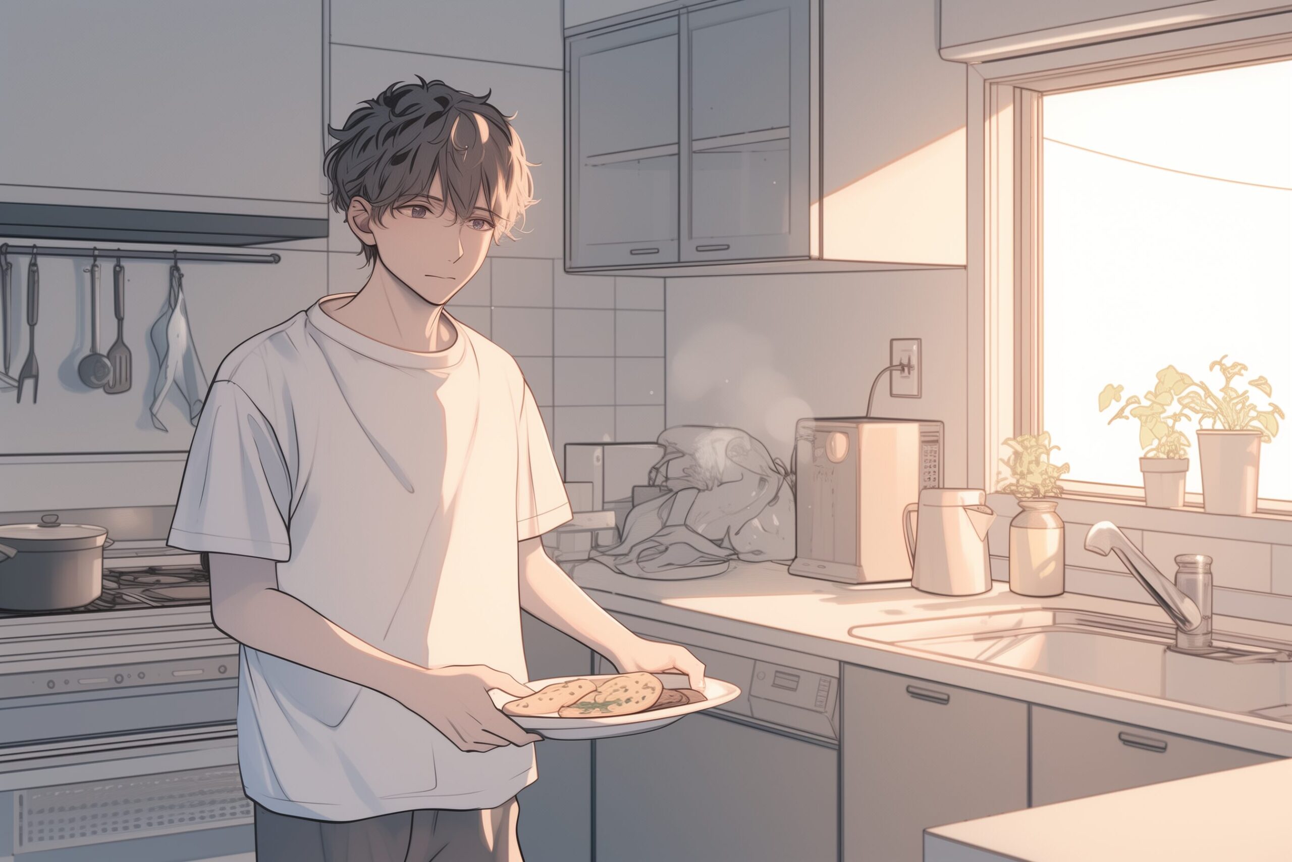 検索タグ:イラスト、ファッション、キャラクター、男性、男、男子、男の子、男の人、アニメ、漫画、マンガ、若い、人物、顔、アート、挿絵、インスタ、Instagram、AI生成画像、fashion、コピースペース、料理、キッチン、調理、朝食、料理人、彼氏