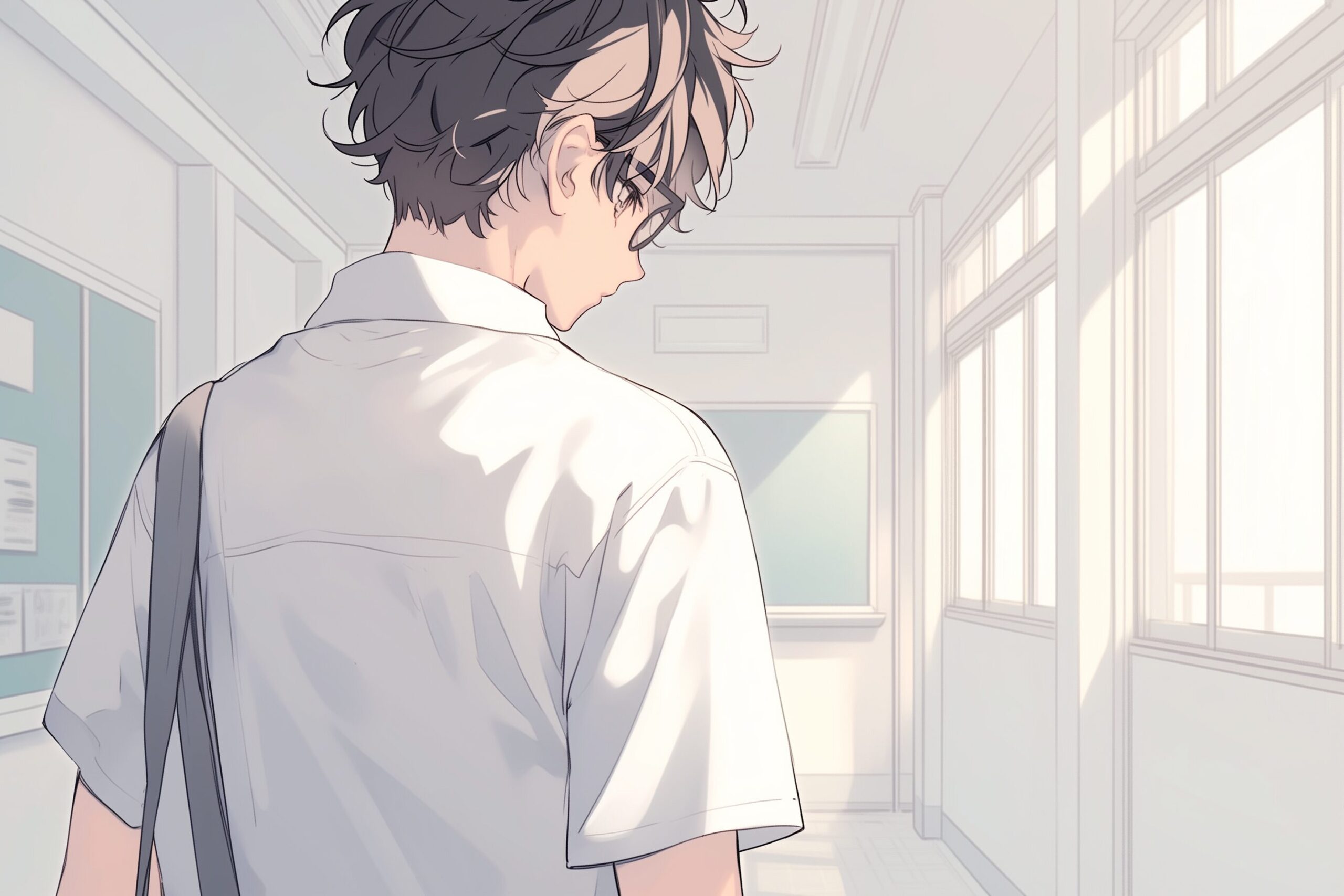 検索タグ:イラスト、キャラクター、男子、男性、男、男の人、アニメ、漫画、マンガ、若い、人物、顔、美しい、綺麗、きれい、キレイ、アート、お洒落、挿絵、インスタ、Instagram、AI生成画像、コピースペース、恋愛、恋、片思い、イケメン、美男、制服、眼鏡、メガネ、めがね、後ろ姿、廊下