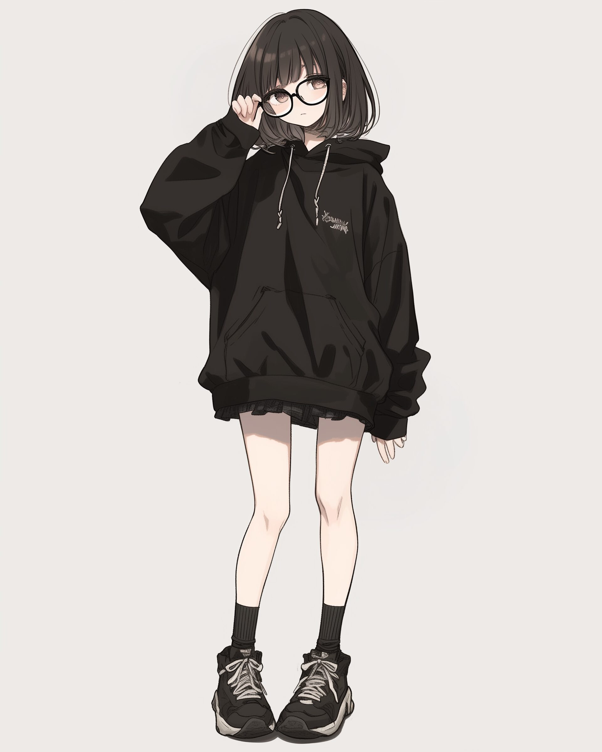 検索タグ:イラスト、キャラクター、女子、女の子、女性、女、女の人、アニメ、漫画、マンガ、若い、人物、顔、美しい、綺麗、きれい、キレイ、アート、お洒落、挿絵、インスタ、Instagram、AI生成画像、コピースペース、かわいい、可愛い、カワイイ、黒髪、橘、たちばな、ゆず、柚、キャラクター、ショートヘア、黒髪、メガネ、眼鏡、めがね、前髪ぱっつん、パッツン、パーカー女子、黒、ブラック、全身、コーディネート、ファッション