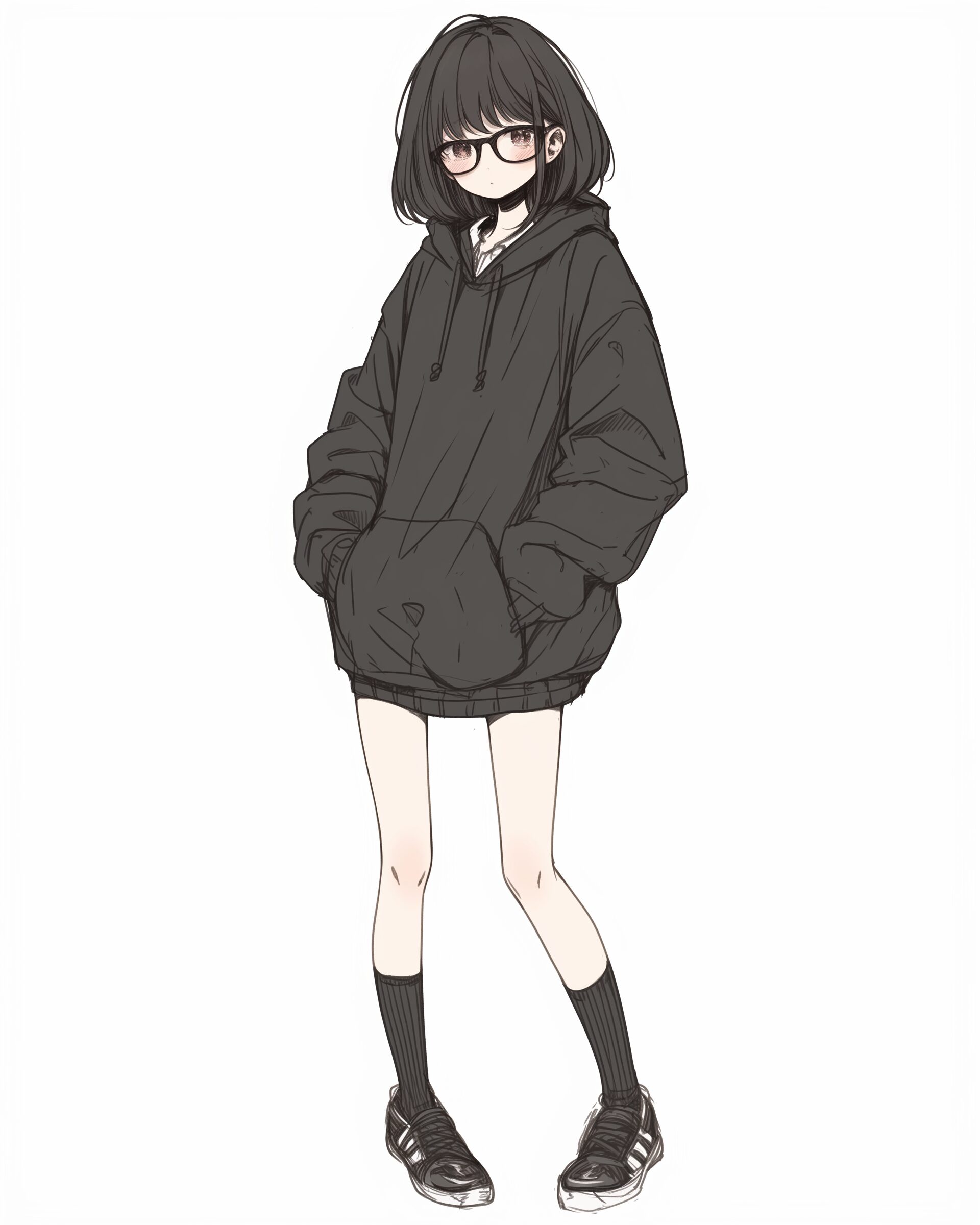 検索タグ:イラスト、キャラクター、女子、女の子、女性、女、女の人、アニメ、漫画、マンガ、若い、人物、顔、美しい、綺麗、きれい、キレイ、アート、お洒落、挿絵、インスタ、Instagram、AI生成画像、コピースペース、かわいい、可愛い、カワイイ、黒髪、橘、たちばな、ゆず、柚、キャラクター、ショートヘア、黒髪、メガネ、眼鏡、めがね、前髪ぱっつん、パッツン、パーカー女子、黒、ブラック、全身、コーディネート、ファッション