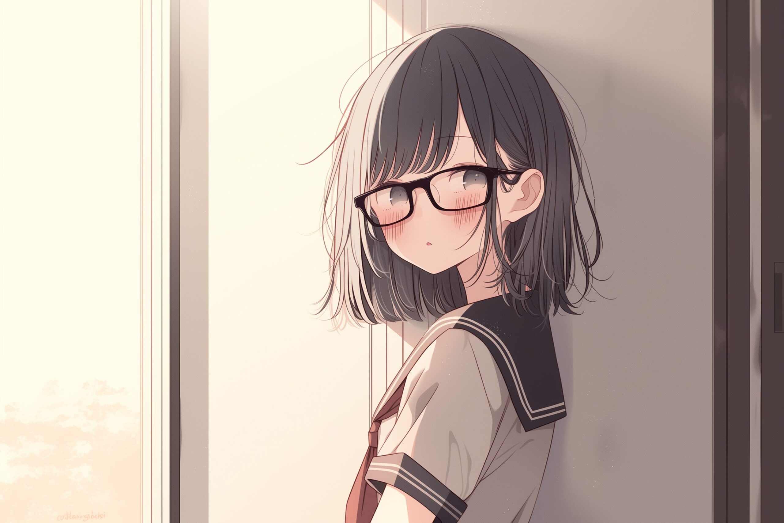 検索タグ:イラスト、キャラクター、女子、女の子、女性、女、女の人、アニメ、漫画、マンガ、若い、人物、顔、美しい、綺麗、きれい、キレイ、アート、お洒落、挿絵、インスタ、Instagram、AI生成画像、コピースペース、かわいい、可愛い、カワイイ、黒髪、橘、たちばな、ゆず、柚、キャラクター、ショートヘア、黒髪、メガネ、眼鏡、めがね、前髪ぱっつん、パッツン、JK、制服、セーラー服、恥ずかしい、照れる、赤面、隠れる