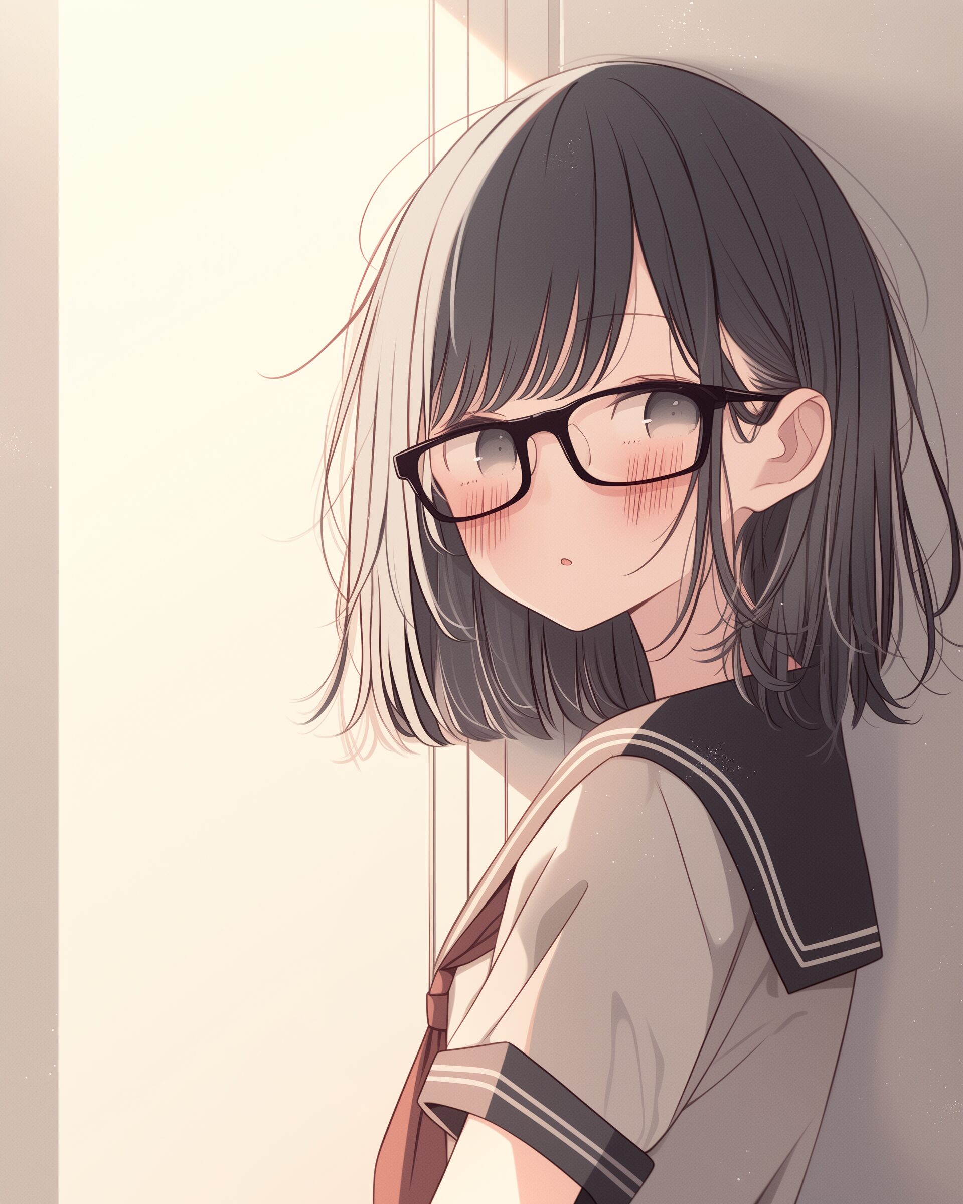 検索タグ:イラスト、キャラクター、女子、女の子、女性、女、女の人、アニメ、漫画、マンガ、若い、人物、顔、美しい、綺麗、きれい、キレイ、アート、お洒落、挿絵、インスタ、Instagram、AI生成画像、コピースペース、かわいい、可愛い、カワイイ、黒髪、橘、たちばな、ゆず、柚、キャラクター、ショートヘア、黒髪、メガネ、眼鏡、めがね、前髪ぱっつん、パッツン、JK、制服、セーラー服、恥ずかしい、照れる、赤面、隠れる