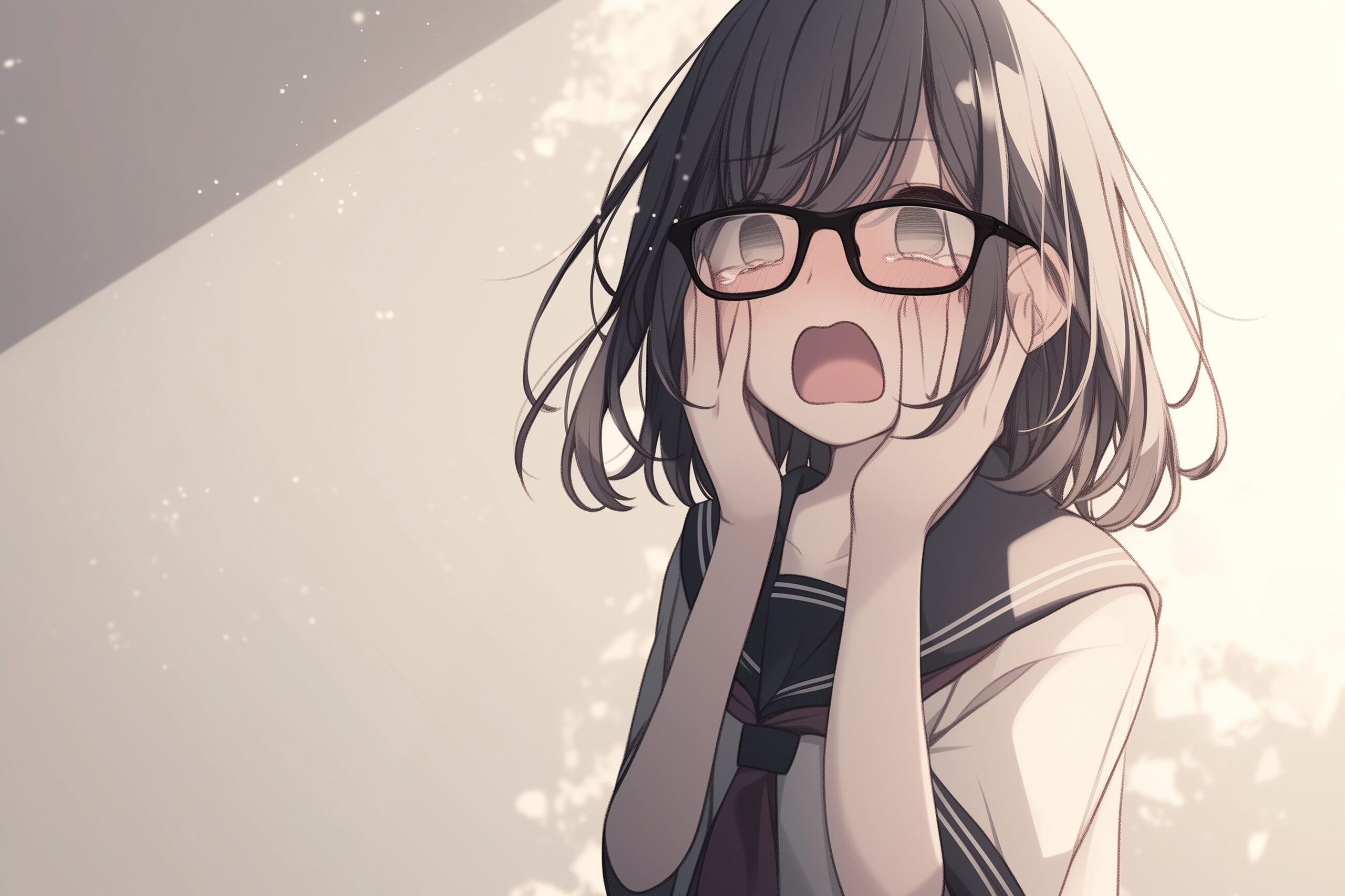 検索タグ:イラスト、キャラクター、女子、女の子、女性、女、女の人、アニメ、漫画、マンガ、若い、人物、顔、美しい、綺麗、きれい、キレイ、アート、お洒落、挿絵、インスタ、Instagram、AI生成画像、コピースペース、かわいい、可愛い、カワイイ、黒髪、橘、たちばな、ゆず、柚、キャラクター、ショートヘア、黒髪、メガネ、眼鏡、めがね、前髪ぱっつん、パッツン、JK、制服、セーラー服、恥ずかしい、照れる、赤面、隠れる