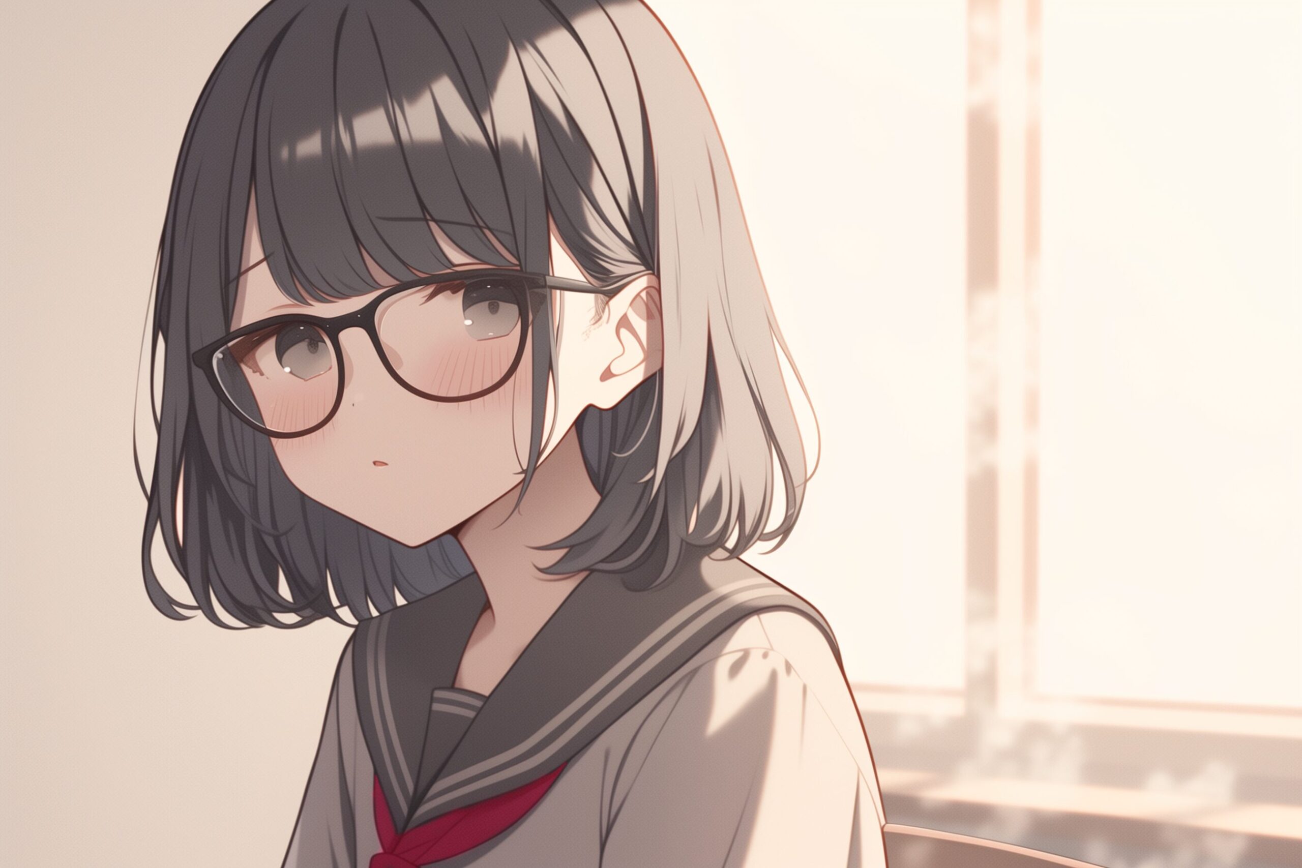 検索タグ:イラスト、キャラクター、女子、女の子、女性、女、女の人、アニメ、漫画、マンガ、若い、人物、顔、美しい、綺麗、きれい、キレイ、アート、お洒落、挿絵、インスタ、Instagram、AI生成画像、コピースペース、かわいい、可愛い、カワイイ、黒髪、橘、たちばな、ゆず、柚、キャラクター、ショートヘア、黒髪、メガネ、眼鏡、めがね、前髪ぱっつん、パッツン、JK、制服、セーラー服、恥ずかしい、照れる、赤面、隠れる