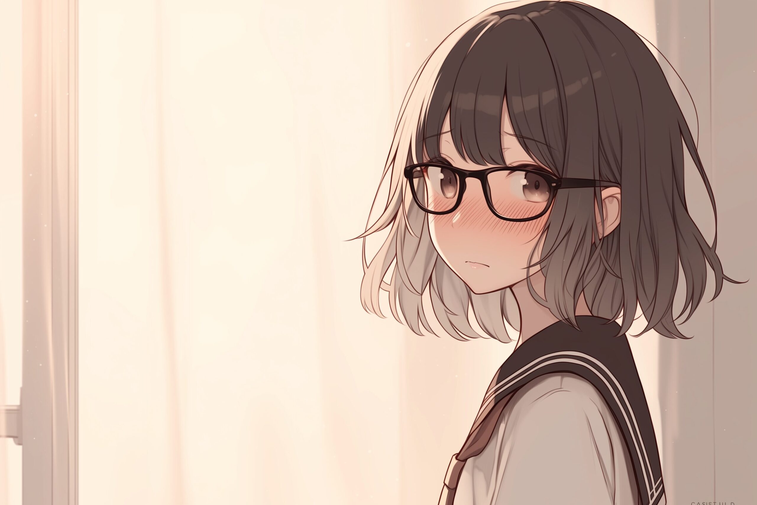 検索タグ:イラスト、キャラクター、女子、女の子、女性、女、女の人、アニメ、漫画、マンガ、若い、人物、顔、美しい、綺麗、きれい、キレイ、アート、お洒落、挿絵、インスタ、Instagram、AI生成画像、コピースペース、かわいい、可愛い、カワイイ、黒髪、橘、たちばな、ゆず、柚、キャラクター、ショートヘア、黒髪、メガネ、眼鏡、めがね、前髪ぱっつん、パッツン、JK、制服、セーラー服、恥ずかしい、照れる、赤面、隠れる