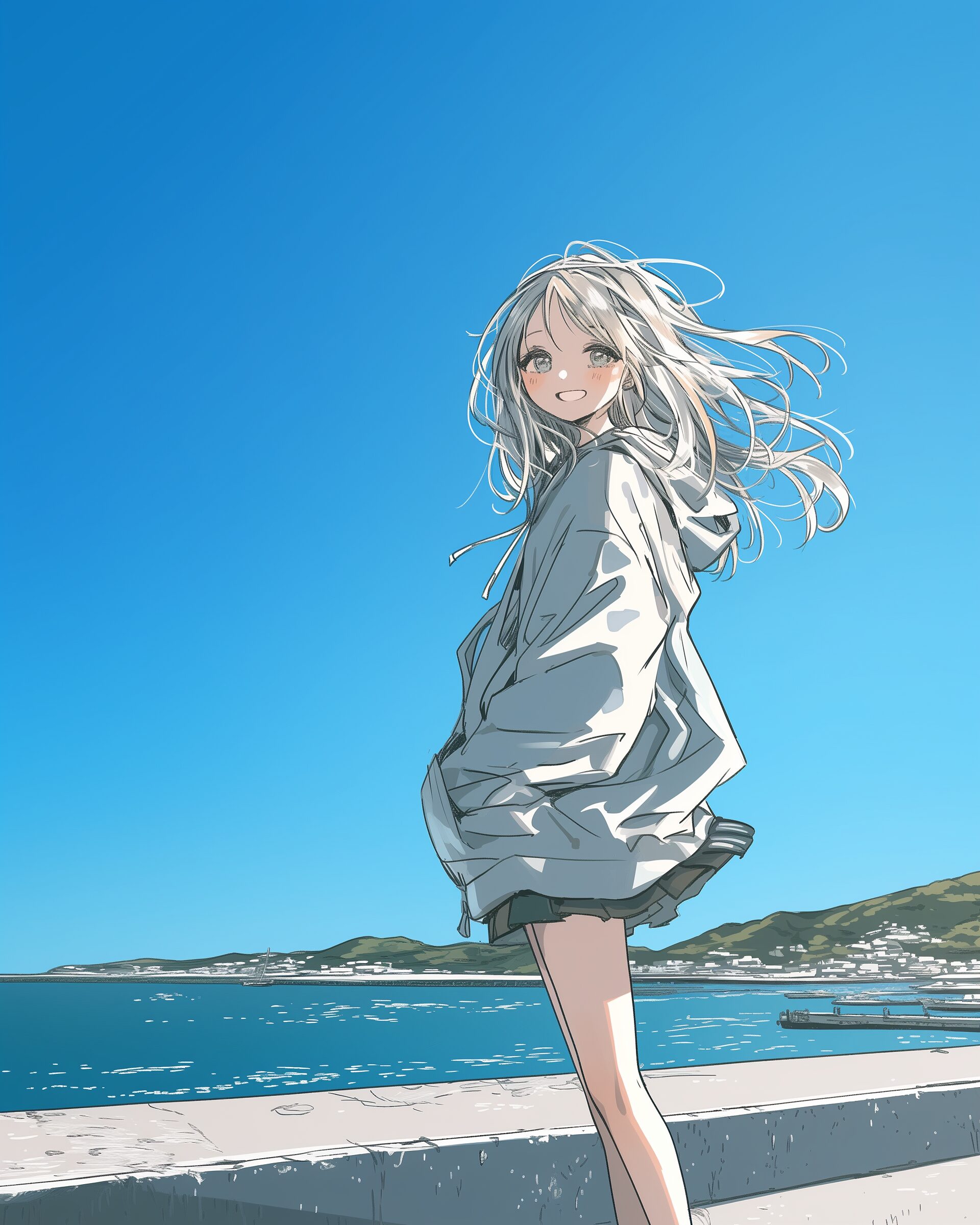 検索タグ:イラスト、ファッション、キャラクター、女性、女、女の子、女子、女の人、アニメ、漫画、マンガ、美人、美女、若い、かわいい、可愛い、カワイイ、人物、顔、美しい、綺麗、きれい、キレイ、アート、お洒落、挿絵、インスタ、Instagram、AI生成画像、fashion、コピースペース、銀髪、笑顔、パーカー女子、海辺、海岸、散歩、海沿い