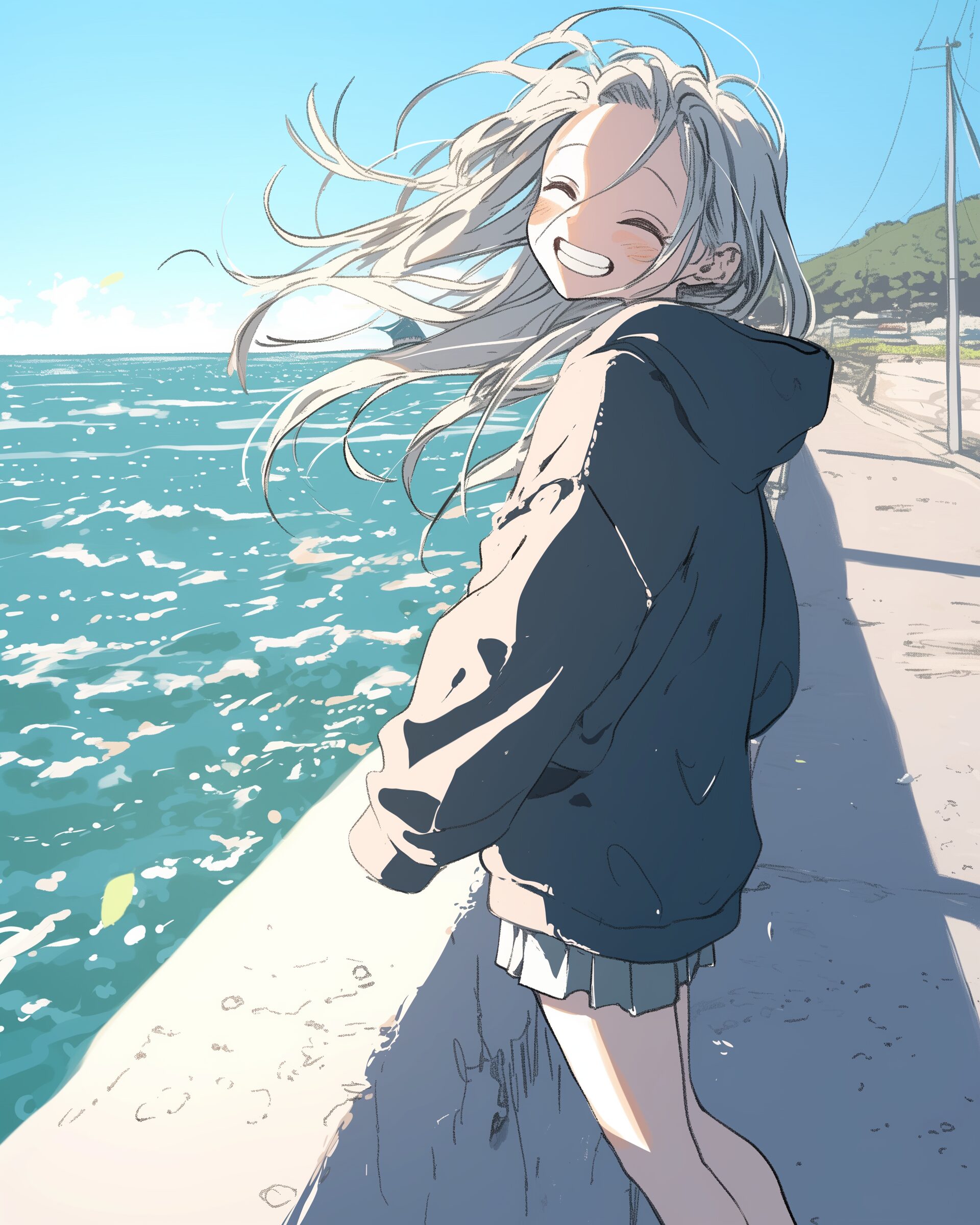 検索タグ:イラスト、ファッション、キャラクター、女性、女、女の子、女子、女の人、アニメ、漫画、マンガ、美人、美女、若い、かわいい、可愛い、カワイイ、人物、顔、美しい、綺麗、きれい、キレイ、アート、お洒落、挿絵、インスタ、Instagram、AI生成画像、fashion、コピースペース、銀髪、笑顔、パーカー女子、海辺、海岸、散歩、海沿い