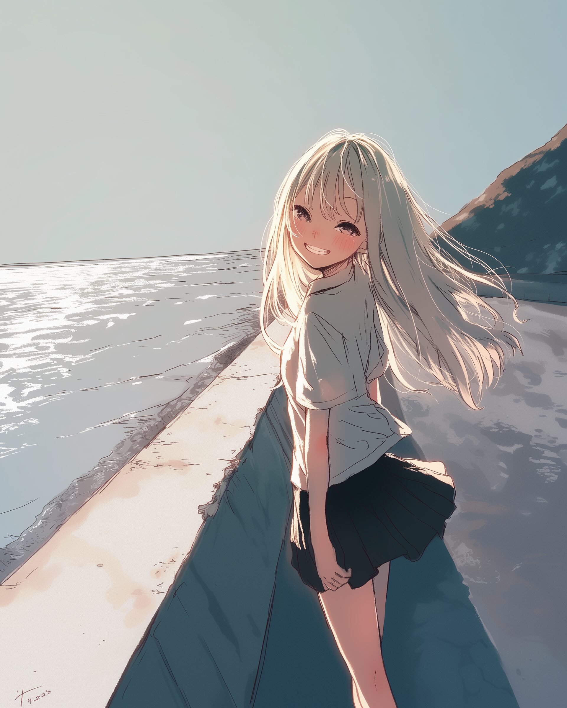 検索タグ:イラスト、ファッション、キャラクター、女性、女、女の子、女子、女の人、アニメ、漫画、マンガ、美人、美女、若い、かわいい、可愛い、カワイイ、人物、顔、美しい、綺麗、きれい、キレイ、アート、お洒落、挿絵、インスタ、Instagram、AI生成画像、fashion、コピースペース、銀髪、笑顔、パーカー女子、海辺、海岸、散歩、海沿い