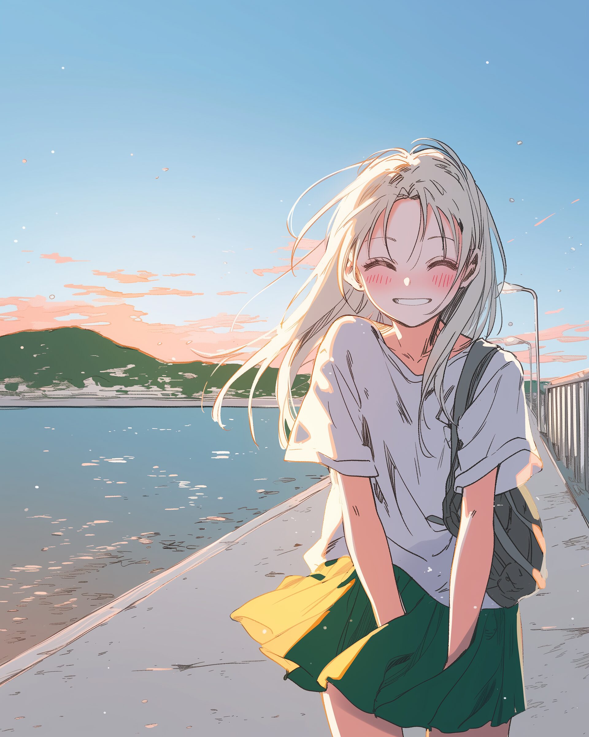 検索タグ:イラスト、ファッション、キャラクター、女性、女、女の子、女子、女の人、アニメ、漫画、マンガ、美人、美女、若い、かわいい、可愛い、カワイイ、人物、顔、美しい、綺麗、きれい、キレイ、アート、お洒落、挿絵、インスタ、Instagram、AI生成画像、fashion、コピースペース、銀髪、笑顔、パーカー女子、海辺、海岸、散歩、海沿い