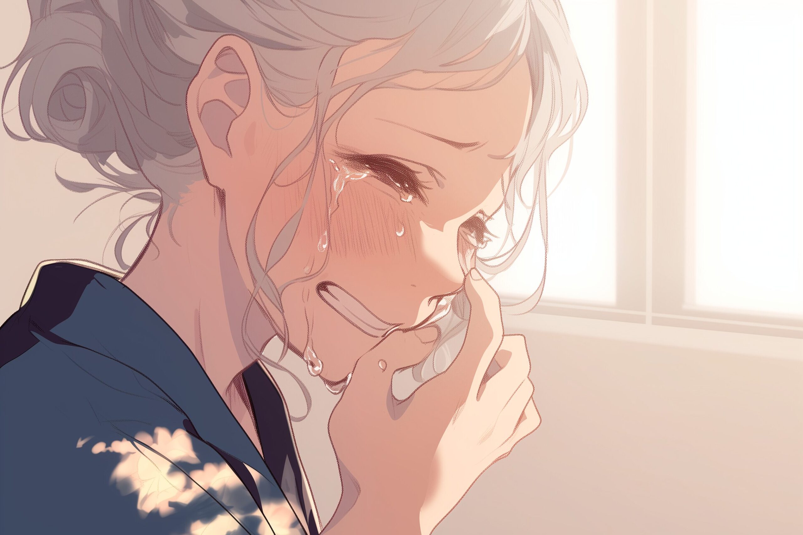 検索タグ:イラスト、キャラクター、女性、女、女の人、アニメ、漫画、マンガ、若い、人物、顔、美しい、綺麗、きれい、キレイ、アート、お洒落、挿絵、インスタ、Instagram、AI生成画像、コピースペース、おばあちゃん、祖母、老人、高齢者、お年寄り、白髪、涙、泣く、悲しい、悲しみ、