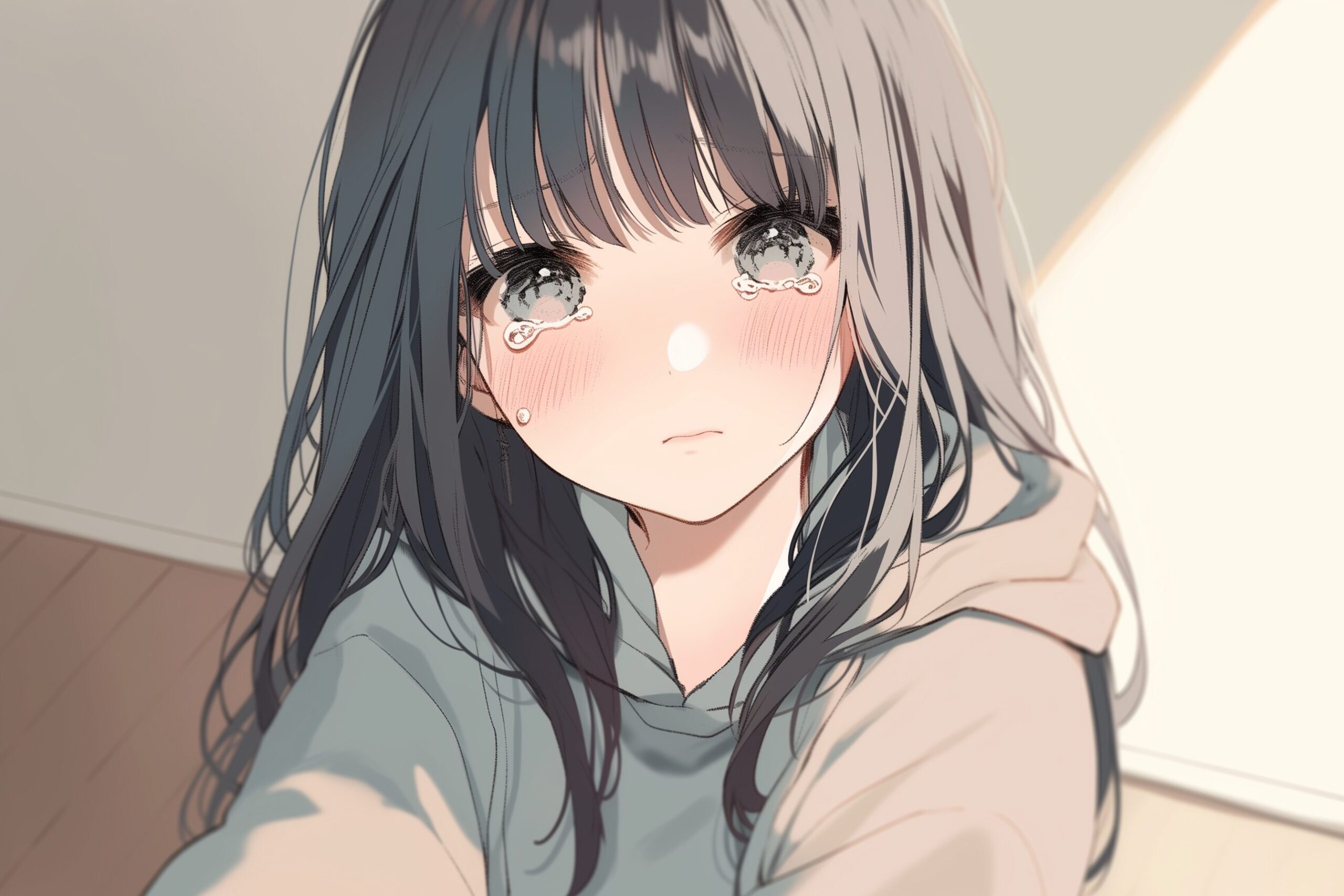 検索タグ:イラスト、キャラクター、女性、女、女の人、アニメ、漫画、マンガ、若い、人物、顔、美しい、綺麗、きれい、キレイ、アート、お洒落、挿絵、インスタ、Instagram、AI生成画像、コピースペース、涙、泣く、悲しい、悲しみ、美女、美人、可愛い、かわいい、kawaii、黒髪、パーカー女子