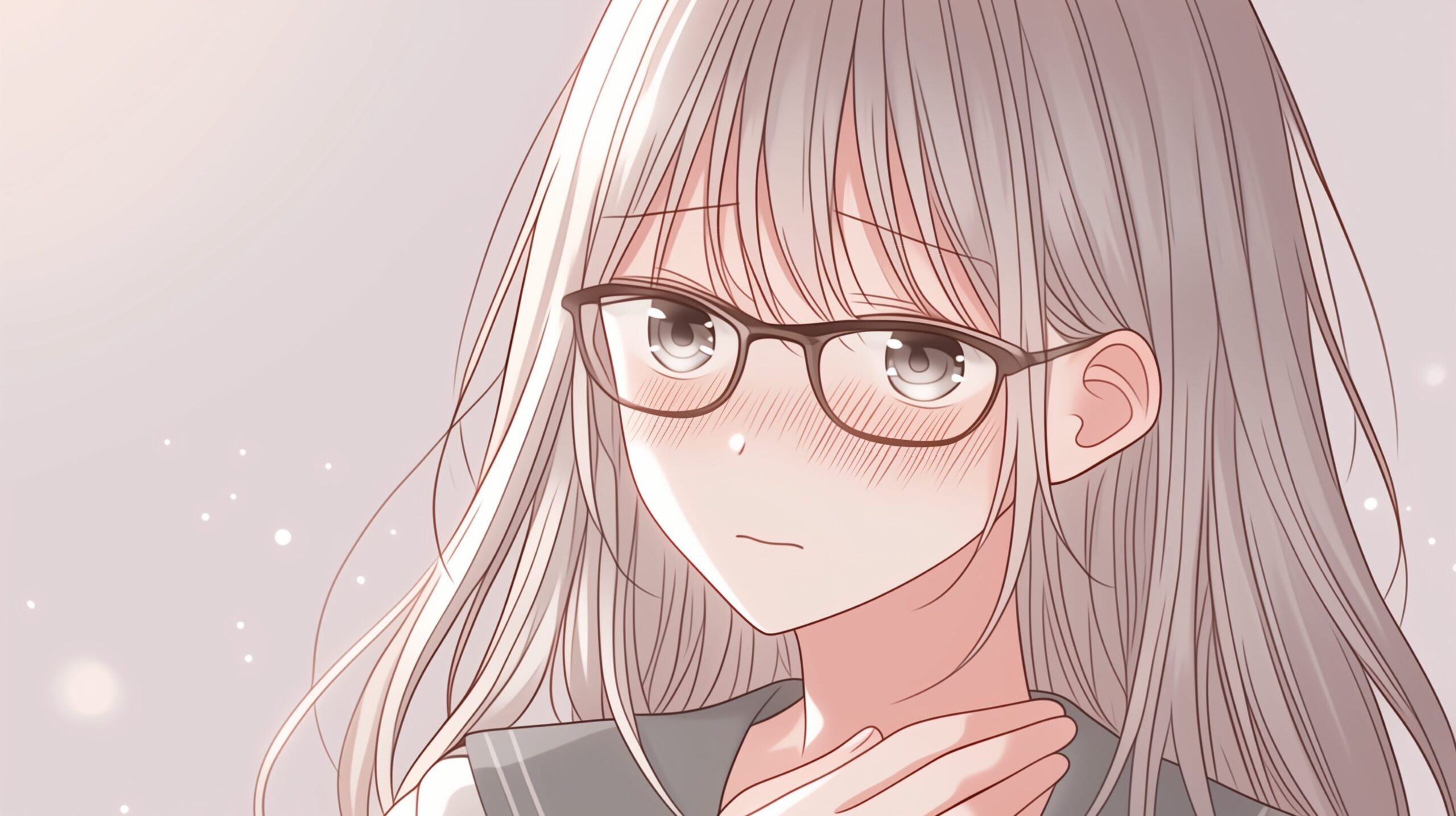 検索タグ:イラスト、ファッション、キャラクター、女性、女、女の子、女子、女の人、アニメ、漫画、マンガ、美人、美女、若い、かわいい、可愛い、カワイイ、人物、顔、美しい、綺麗、きれい、キレイ、アート、お洒落、挿絵、インスタ、Instagram、AI生成画像、fashion、コピースペース、学生、高校生、銀髪、シルバーヘア、眼鏡、メガネ、めがね、恥ずかしい、緊張、照れる、ドキドキ、胸キュン、神様勇気をください