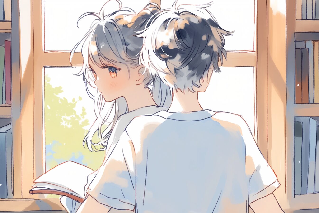 検索タグ:イラスト、ファッション、キャラクター、女性、女、女の子、女子、女の人、アニメ、漫画、マンガ、美人、美女、若い、かわいい、可愛い、カワイイ、人物、顔、美しい、綺麗、きれい、キレイ、アート、お洒落、挿絵、インスタ、Instagram、AI生成画像、コピースペース、カップル、恋人、愛、恋、恋愛、黒髪、制服、卒業式、春、卒業、学生、高校生、中学生、笑顔、仲良し、寄り添う、黒髪、眼鏡、メガネ、めがね、男、男性、図書室、図書館
