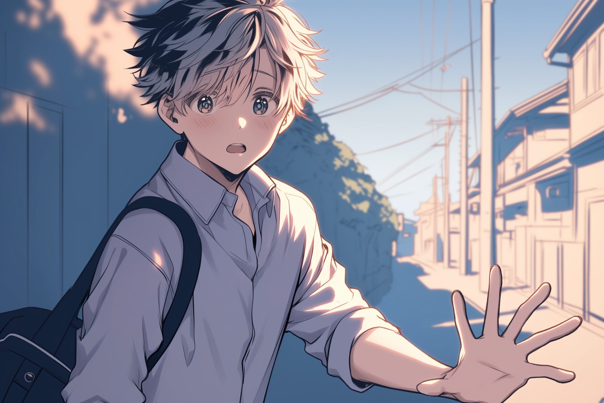 検索タグ:イラスト、キャラクター、男子、男性、男、男の人、アニメ、漫画、マンガ、若い、人物、顔、美しい、綺麗、きれい、キレイ、アート、お洒落、挿絵、インスタ、Instagram、AI生成画像、コピースペース、恋愛、恋、片思い、イケメン、美男、制服、手を振る、手をあげる、挨拶