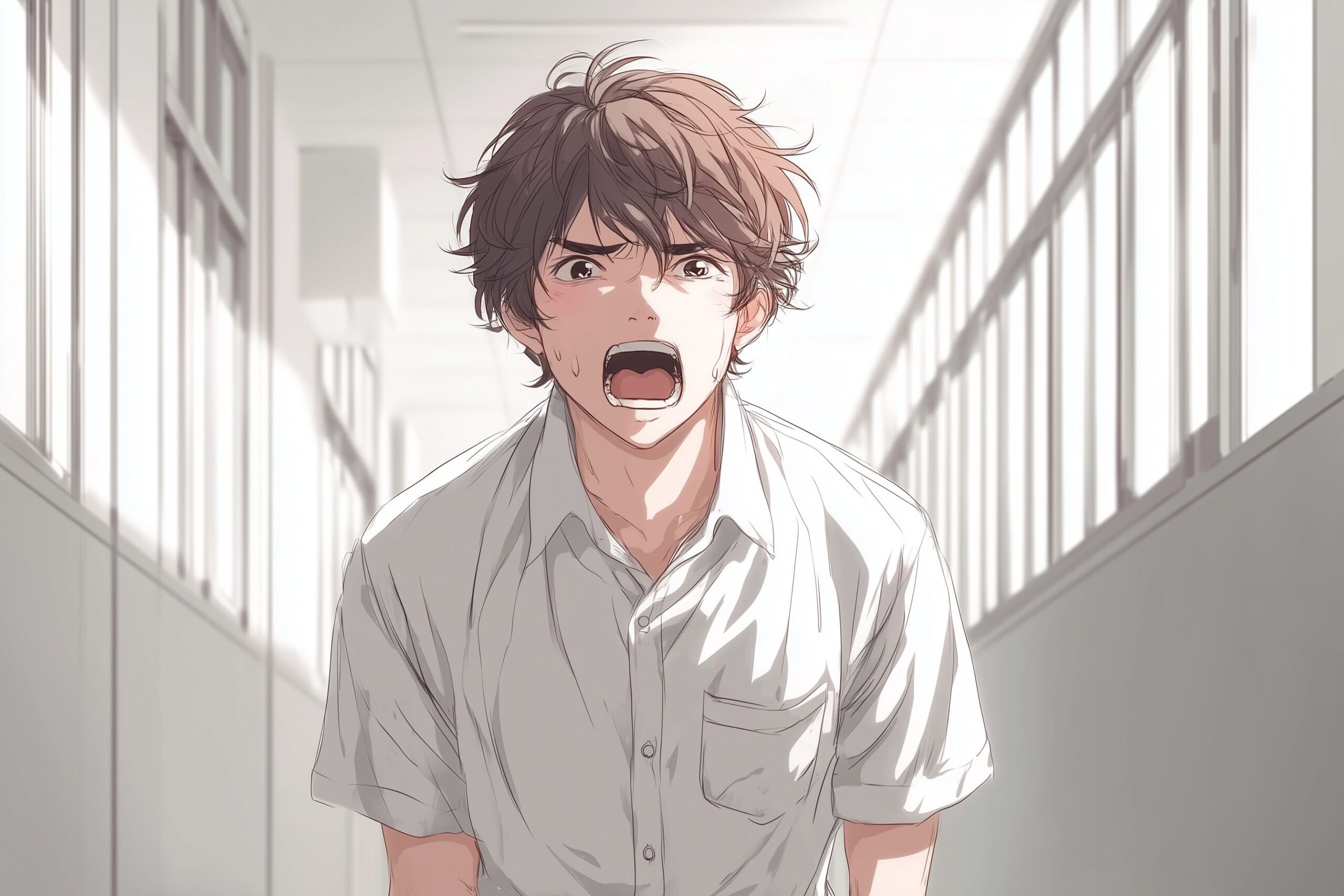検索タグ:イラスト、ファッション、キャラクター、男性、男、男子、男の子、男の人、アニメ、漫画、マンガ、若い、人物、顔、アート、挿絵、インスタ、Instagram、AI生成画像、fashion、コピースペース、学生、高校生、叫ぶ、茶髪