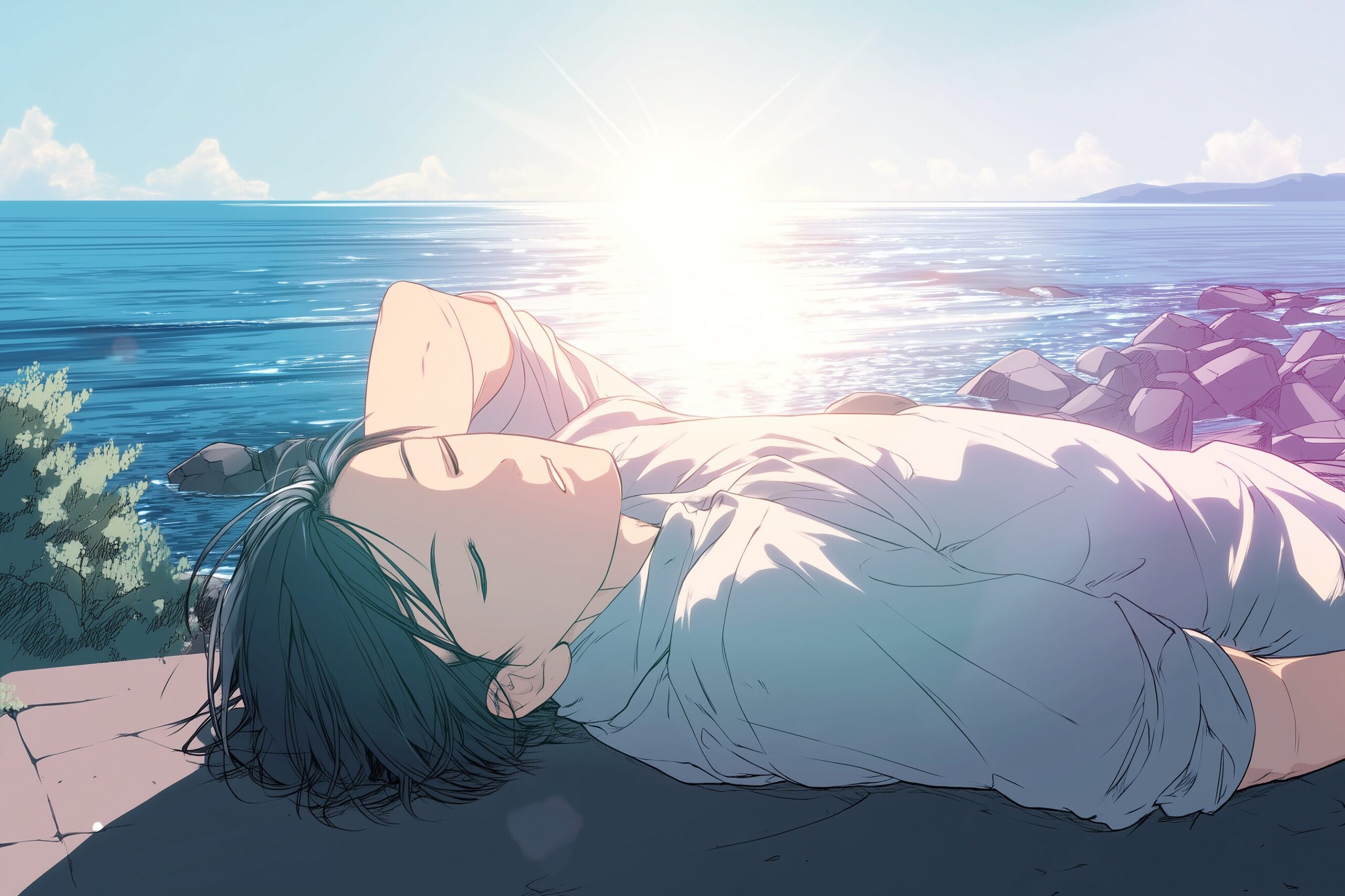 検索タグ:イラスト、ファッション、キャラクター、男性、男、男子、男の子、男の人、アニメ、漫画、マンガ、若い、人物、顔、アート、挿絵、インスタ、Instagram、AI生成画像、fashion、コピースペース、学生、高校生、海辺、防波堤、眠る、お昼寝、寝る