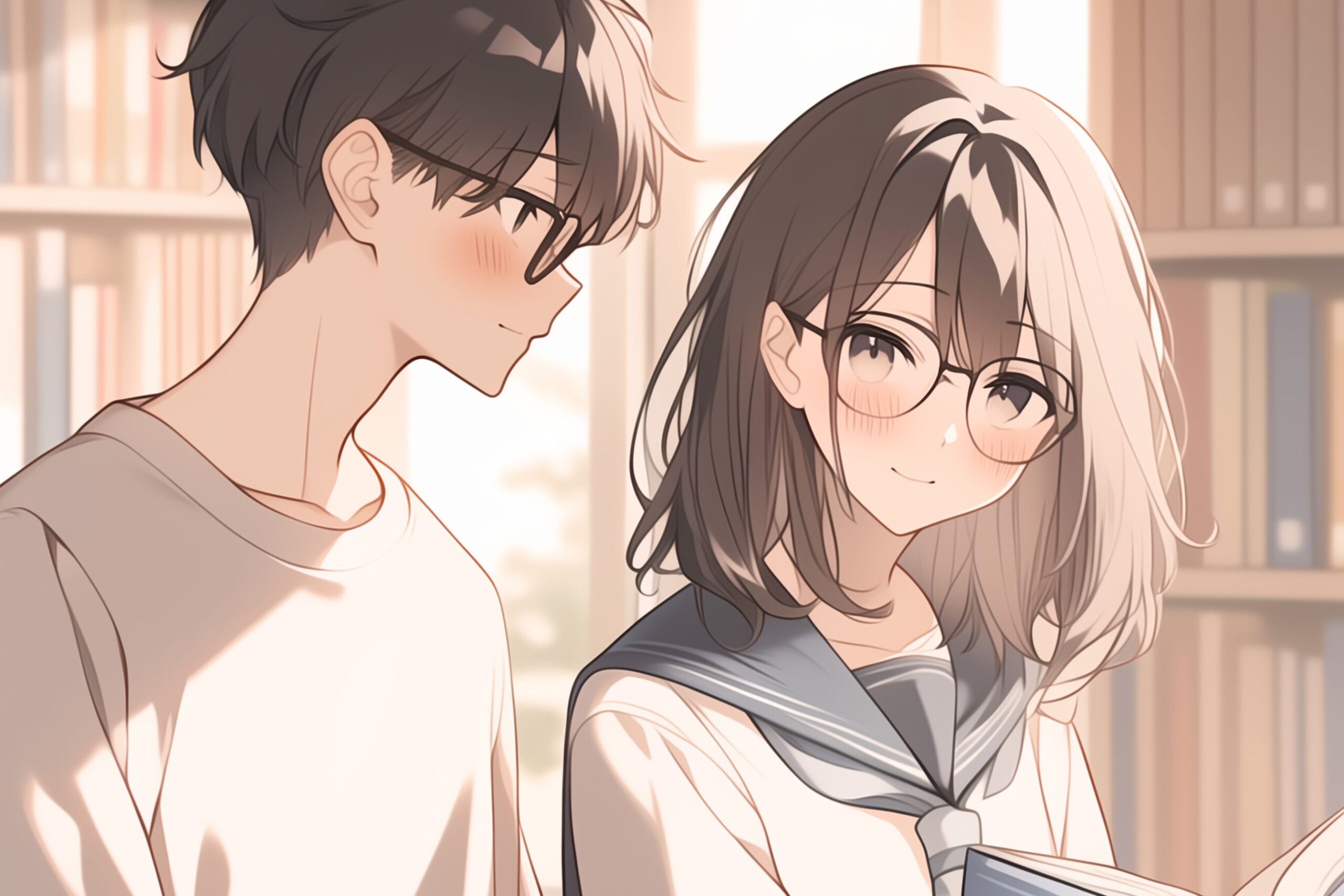 検索タグ:イラスト、キャラクター、女性、女、女の子、女子、女の人、アニメ、漫画、マンガ、美人、美女、若い、かわいい、可愛い、カワイイ、人物、顔、美しい、綺麗、きれい、キレイ、アート、お洒落、挿絵、インスタ、Instagram、AI生成画像、コピースペース、カップル、幸せ、恋愛、デート、恋、片思い、両思い、エモい、仲良し、友達、学生、高校生、中学生、恋人、眼鏡、めがね、メガネ、図書館、図書室、本