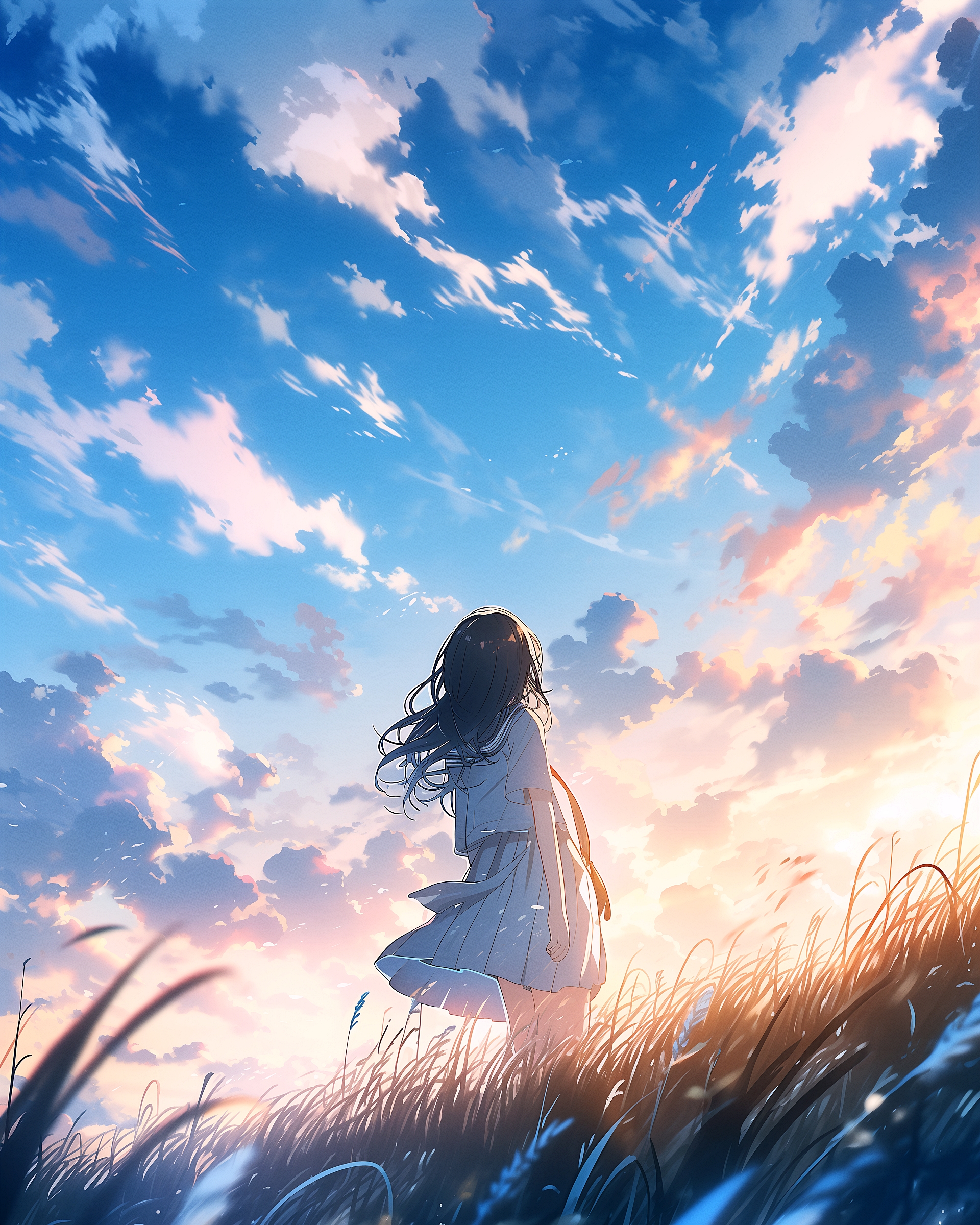 検索タグ:イラスト、キャラクター、女性、女、女の子、女子、女の人、アニメ、漫画、マンガ、若い、人物、美しい、綺麗、きれい、キレイ、芸術、アート、お洒落、おしゃれ、オシャレ、後ろ姿、考え事、考える、悩み、悩みごと、悩む、空、青空、学生、夕空、夕方、コピースペース