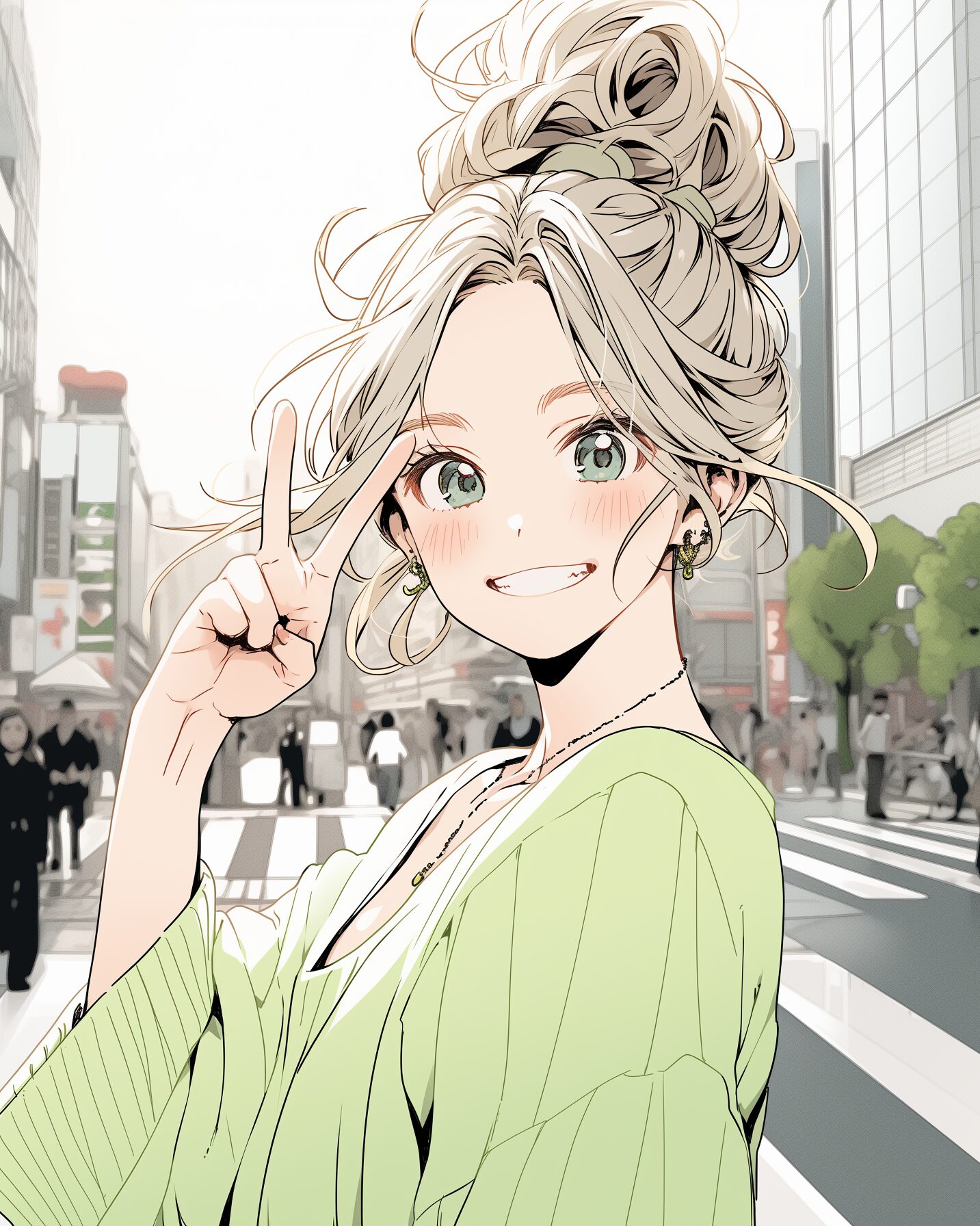 検索タグ:イラスト、ファッション、キャラクター、女性、女、女の子、女子、女の人、アニメ、漫画、マンガ、美人、美女、若い、かわいい、可愛い、カワイイ、人物、顔、美しい、綺麗、きれい、キレイ、アート、お洒落、女子高生、JK、挿絵、夏、春、パステルカラー、春服、インスタ、Instagram、お団子ヘア、緑、グリーン、Green、笑顔