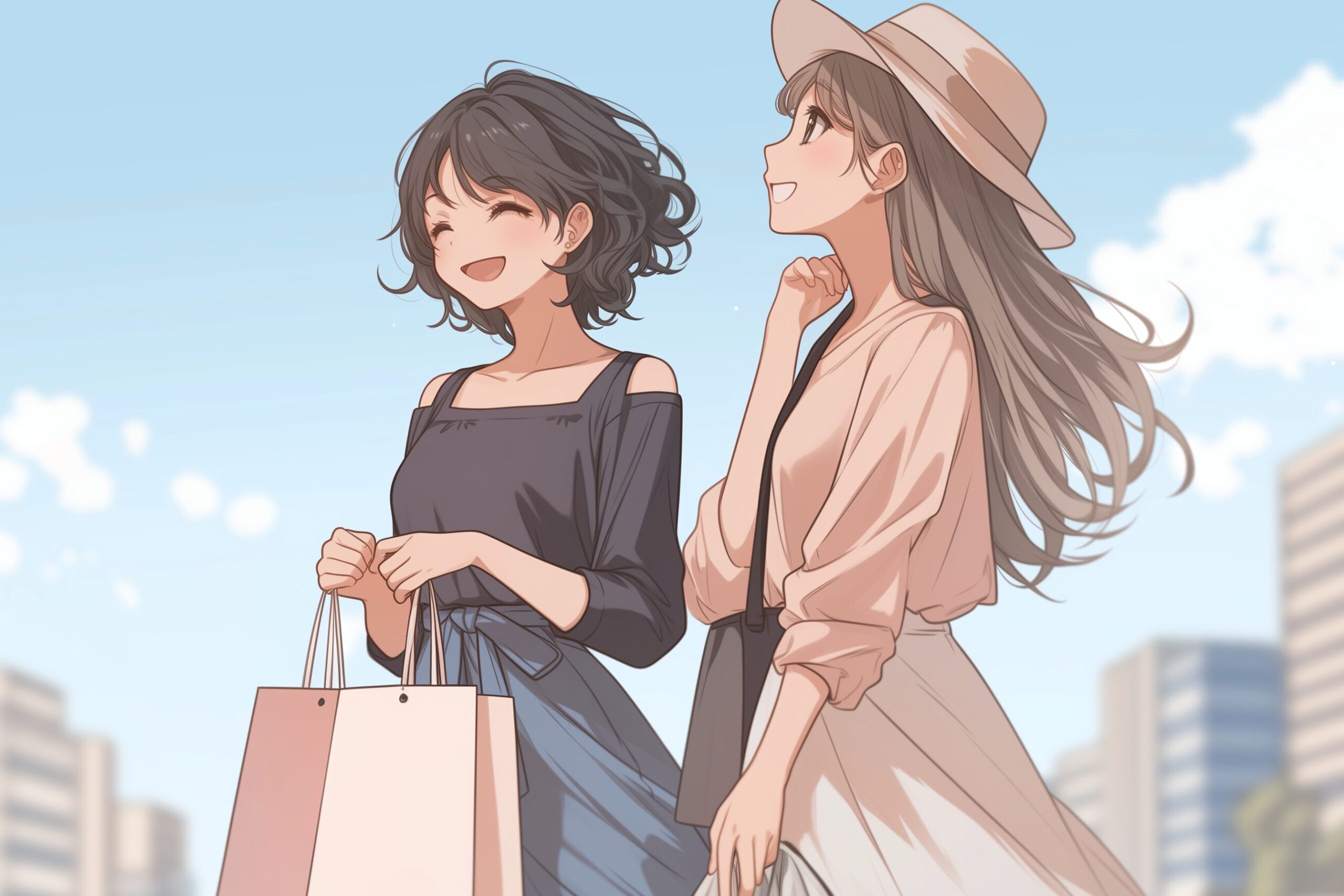 検索タグ:イラスト、ファッション、キャラクター、女性、女、女の子、女子、女の人、アニメ、漫画、マンガ、美人、美女、若い、かわいい、可愛い、カワイイ、人物、顔、美しい、綺麗、きれい、キレイ、アート、お洒落、挿絵、インスタ、Instagram、AI生成画像、fashion、コピースペース、笑顔、2人、友達、買い物、ショッピング、仲良し、オシャレ、おしゃれ
