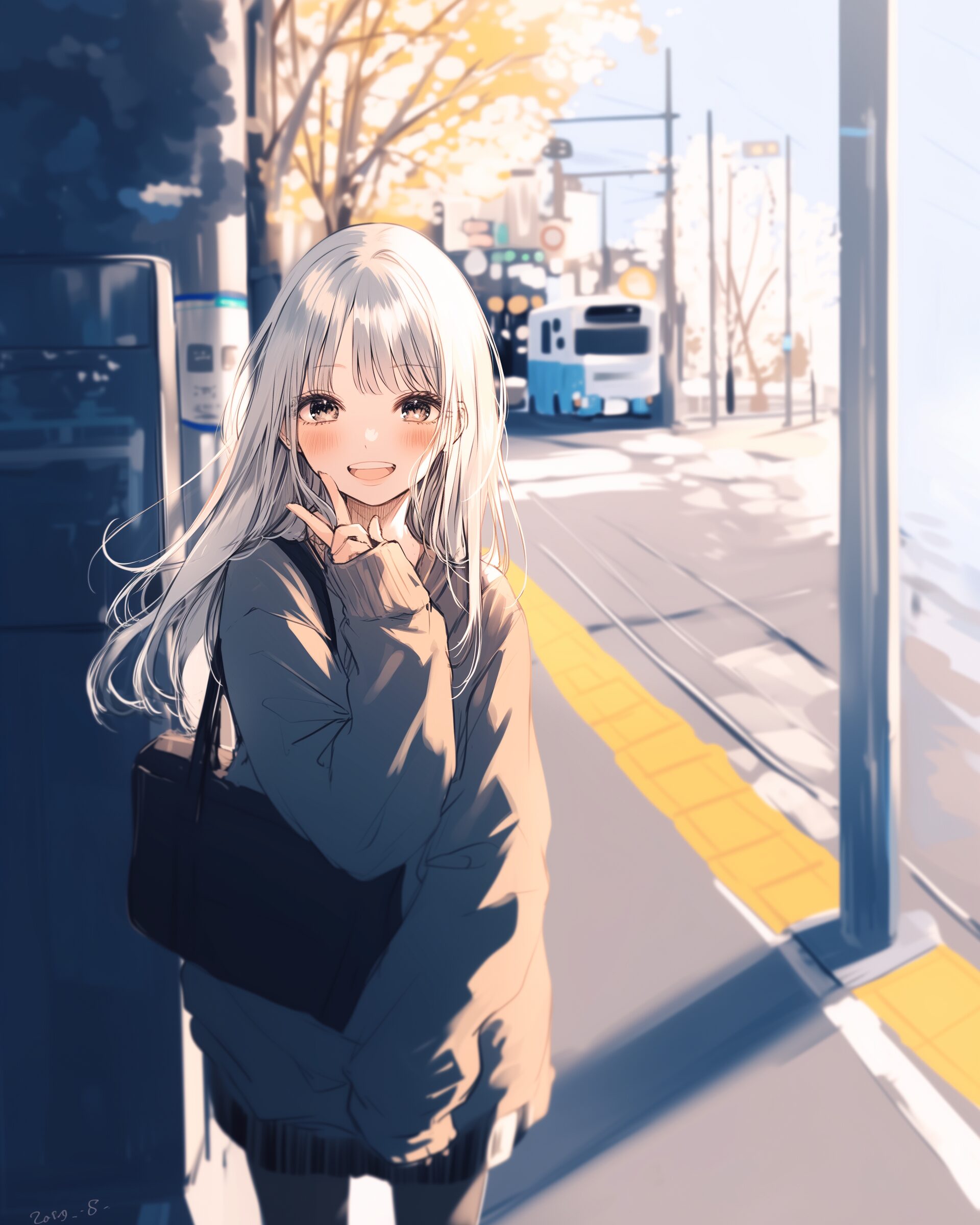 検索タグ:イラスト、ファッション、キャラクター、女性、女、女の子、女子、女の人、アニメ、漫画、マンガ、美人、美女、若い、かわいい、可愛い、カワイイ、人物、顔、美しい、綺麗、きれい、キレイ、アート、お洒落、挿絵、インスタ、Instagram、AI生成画像、fashion、コピースペース、銀髪、お出かけ、街中、笑顔