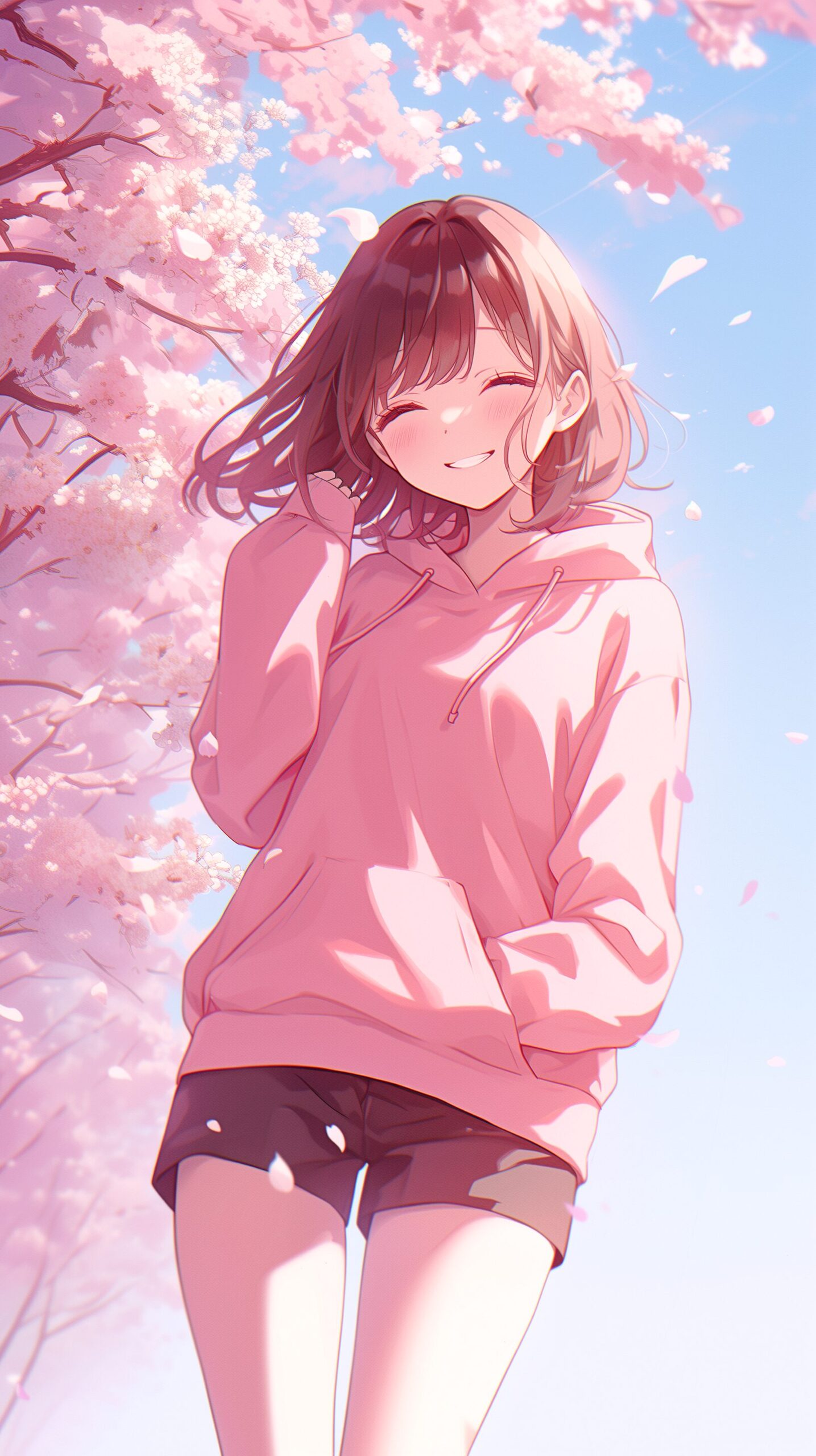 【壁紙】桜とピンクパーカーを着たかわいい女の子イラスト09
