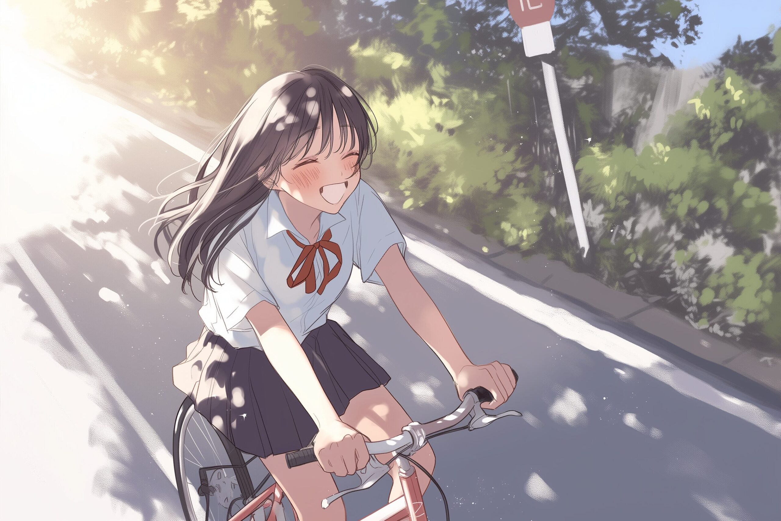 検索タグ:イラスト、ファッション、キャラクター、女性、女、女の子、女子、女の人、アニメ、漫画、マンガ、美人、美女、若い、かわいい、可愛い、カワイイ、人物、顔、美しい、綺麗、きれい、キレイ、アート、お洒落、挿絵、インスタ、Instagram、AI生成画像、fashion、コピースペース、笑顔、JK、制服、学生、高校生、中学生、夏、春、黒髪、自転車、通学、チャリ、チャリンコ